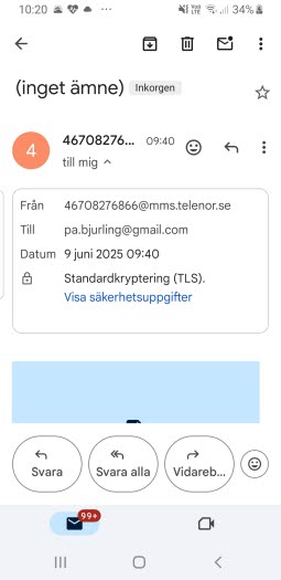 Kollade avsändaren genom att klicka på den lilla pilen/haken högt upp i adressfältet efter "till mig". Där ser man Från: 46708276866@mms.telenor.se. Jag meddelar Telenor om detta och konstaterar ett bedrägeriförsök.