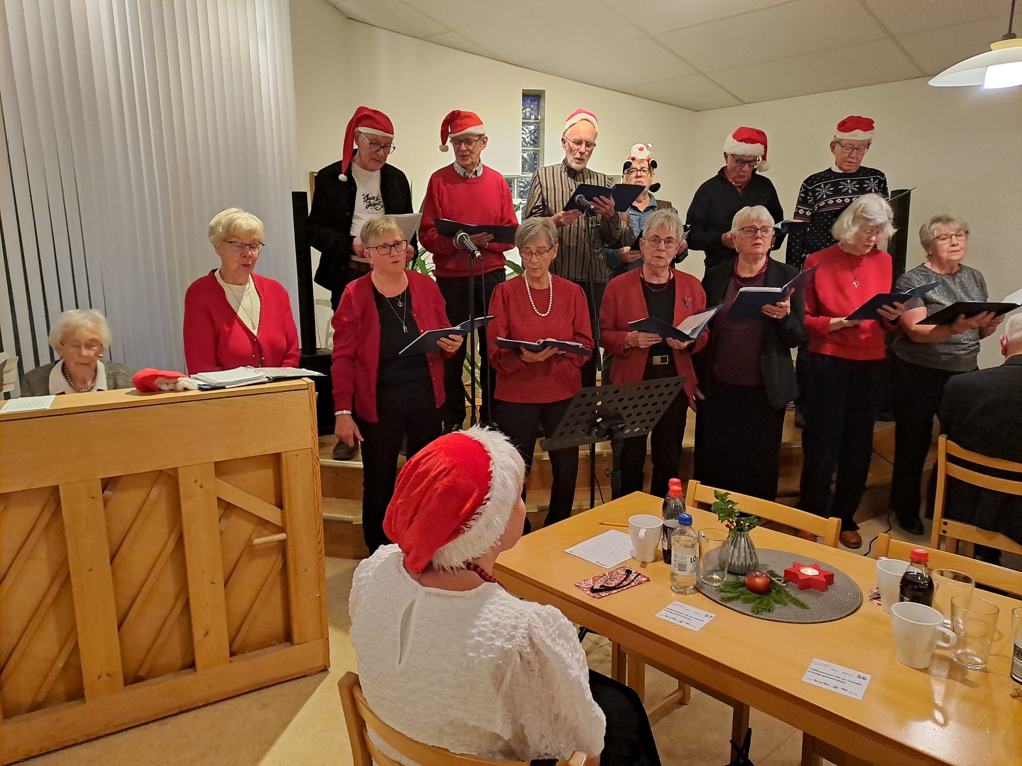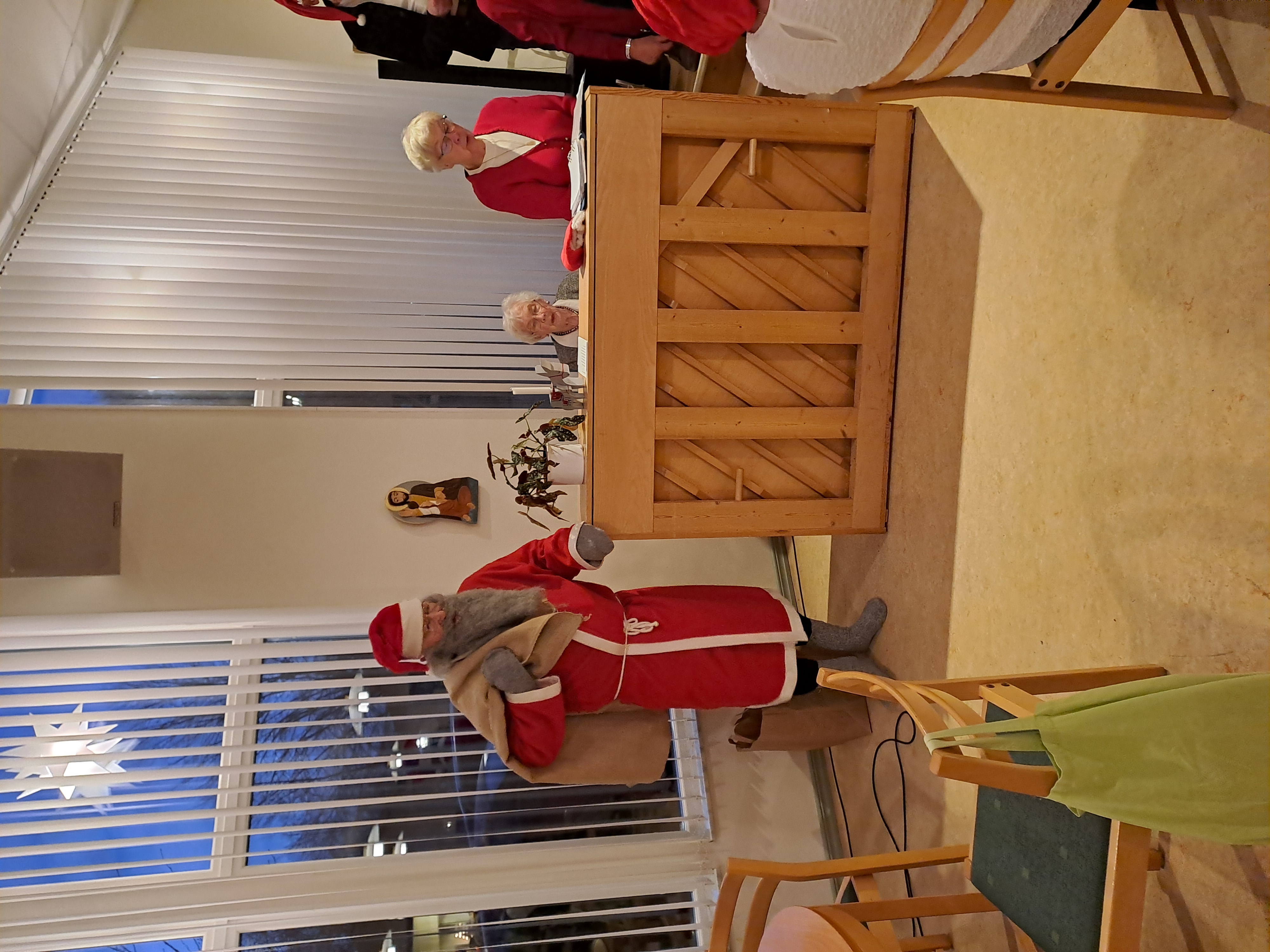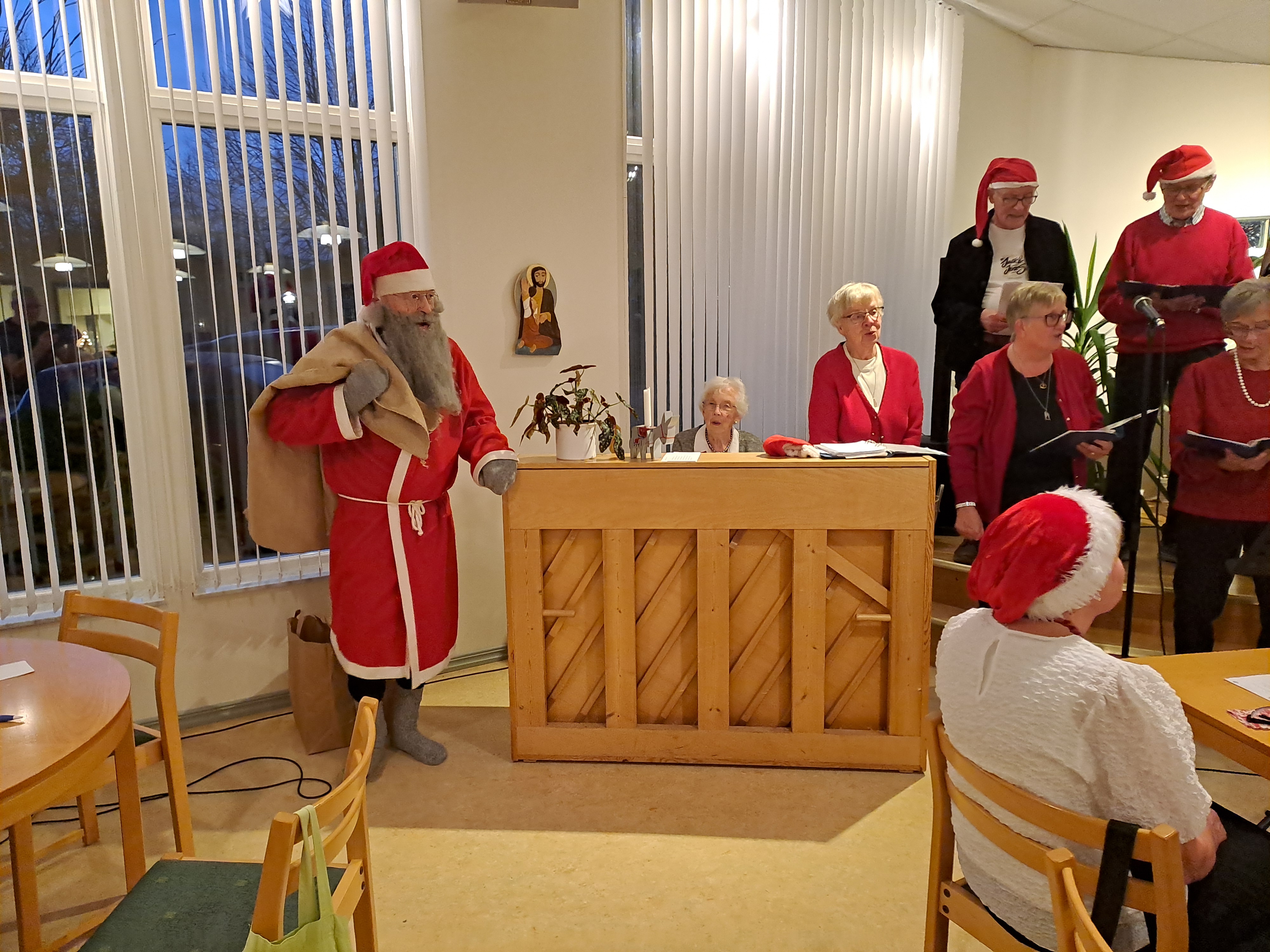 Denna dag var fikat ersatt av en jättefin jullandgång men också en pepparkaka, skumtomte och kaffe som konsumerades under livligt samtalande vid borden. Efteråt hann vi med ett litet julquiz innan det var dags för SPF körens julsånger. De bjöd på såväl gamla som nya sånger framförda med ett proffsigt framförande. Plötsligt uppenbarade sig Tomten med säcken på ryggen. Här fanns givetvis julklappar som delades ut. Festen avslutades med att vår ordförande Ing-Mari önskade alla en God Jul och ett Gott Nytt År.
