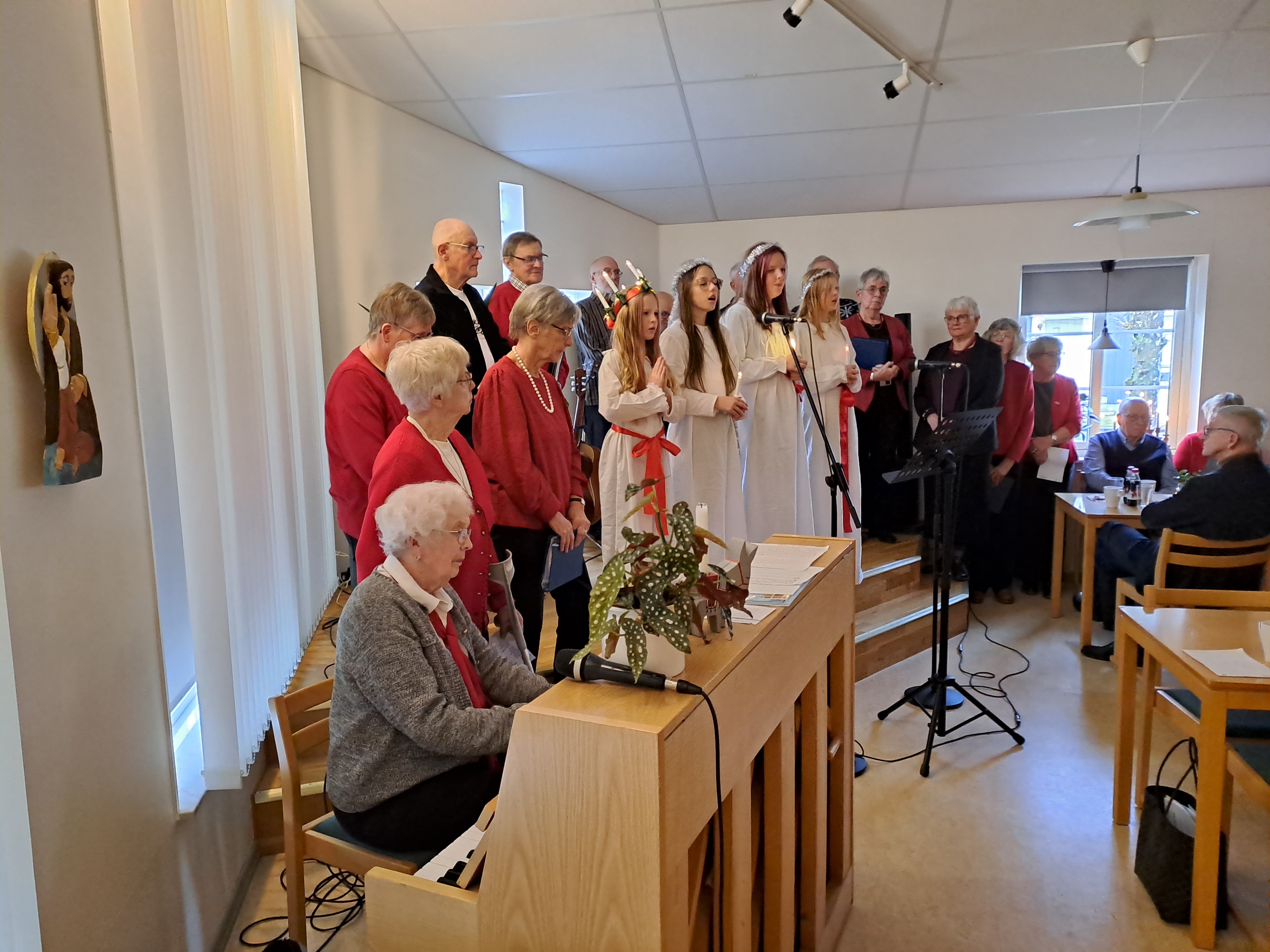 Att ha julfest är alltid trevligt. Det visade sig stämma när ett hundratal medlemmar infann sig till årets julfest hos SPF Seniorerna i Sävsjö under onsdag eftermiddag den 10 december. Lokalen var dukad och pyntad med allehanda juldekorationer och det andades julstämning redan när vi hälsades välkomna vid entrén. Och det blev bara mer jul då vår kör inledde med en vacker julsång. Och när Lucia och hennes tre tärnor kom in blev det ju riktig fint.