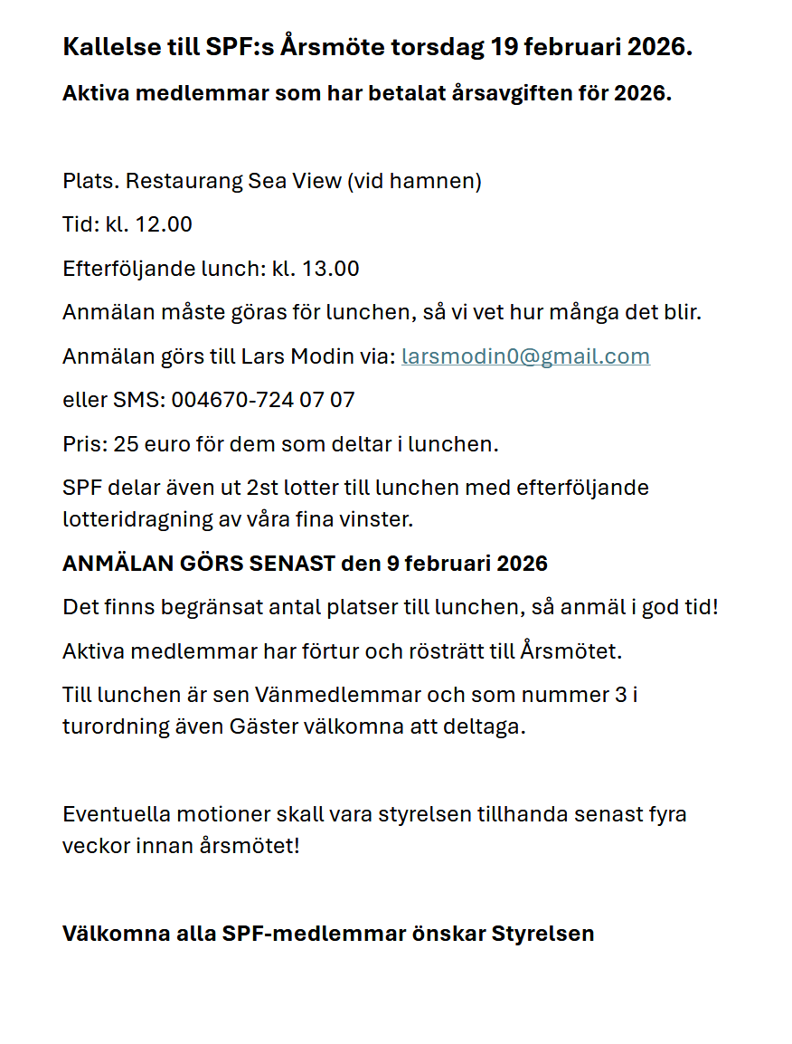 SPF Årsmöte 19/2 Kl. 12.00 på SEA VIEW.