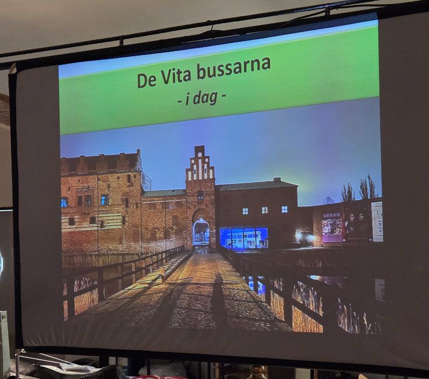 C:a 120 medlemmar var på plats och och först en lunch och lyssande sedan på föredraget om det vita bussarna. Vi fick bl.a. veta att det vita bussarna inte alls var vita från början utan vanligt militärgröna. Malmös alla målare blev engagerade att måla om bussarna strax före bussarna skulle lämna Sverige.