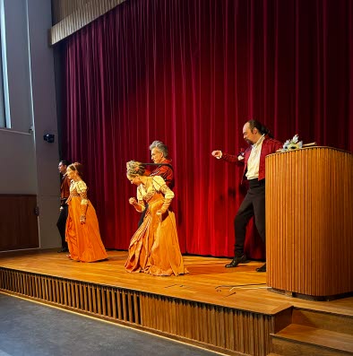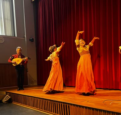 Efter årsmötesförhandlingarna blev det underhållning. Vi gästades av en kvartett ur Romeo & Juliakören plus en medlem som spelade på luta. Det går inte att skriva ett vanligt referat om denna totalupplevelse. Det var sång, musik, dans och agerande och vackra dräkter. Temat var anpassat efter årstiden, nämligen maskerad. Musiken var av den italienska renässanskompositören Bartolomeo Tromboncino. Den lilla italienska som jag kan hjälpte inte mycket, för man sjöng på ett ålderdomligt och dialektalt språk. Men aktörerna förklarade vad som var på gång, och mimik och agerande bidrog också till att man förstod.