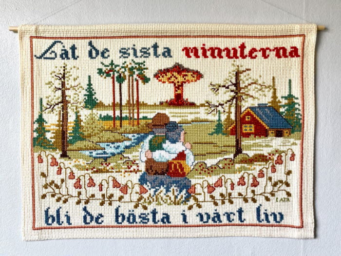 Båda är intressanta. Den billigaste är ett broderi à la traditionell bonad, där konstnären Carina Tabbert, broderat ett äldre par som sitter och tittar mot horisonten. Där syns ett atombombsmoln och man kan läsa visdomsord inspirerade av Lasse Stefanz hit ”Låt de sista ljuva åren” men ”åren” är utbytta mot ”minuterna”.