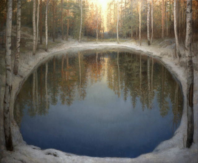 En annan vacker landskapsmålning, av Matilda Bjurström, föreställer en skogstjärn. Den är mycket naturtrogen men ändå lätt förvrängd i sitt perspektiv. En helt annan teknik har Fredrik Lindqvist, som gjort ett landskap i form av trätryck på textil. Han skurit ut motiv och sedan tryckt i olika omgångar i olika färger på 20 tygrutor och sedan sytt ihop dem. Imponerande!