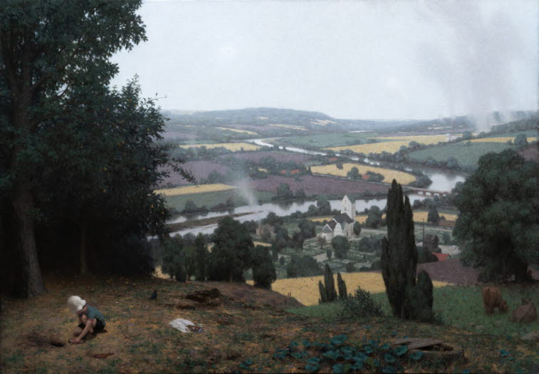 Den dyraste av Karl Wenngren är ett landskap som påminner lite om ett 1800-talsmålning. Det ser romantiskt och rofyllt ut. Men det finns detaljer som för oss till nutiden, såsom den lilla gossen i förgrunden i moderna kläder, något som ser ut som en plastpåse på marken, rökar från fabriksskorstenar, ja till och med ett vindkraftverk.