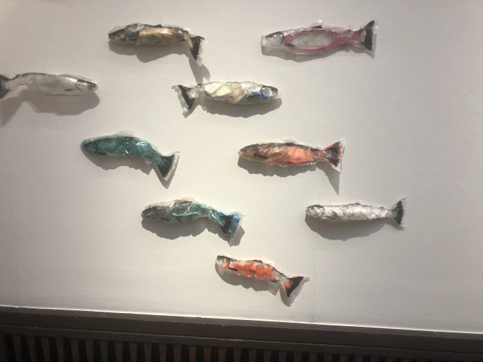 Som sagt, vi kunde inte se allt på visningen, och jag kan inte ens återge allt det vi såg. Jag slutar med två verk med motiv från naturen. Det ena av Tove Gulliksen, miljökritiskt. Hon har gjort fyra laxar av plast och skräp som hon hittat på stränderna. Det är vackert på håll men otäckt när man ser närmare på varje fisk. Så slutligen älgen av Hilda Lagerlöf, utställningens yngsta. Älgen har extra horn och det får man tolka som man vill. Även det är både vackert och lite otäckt.