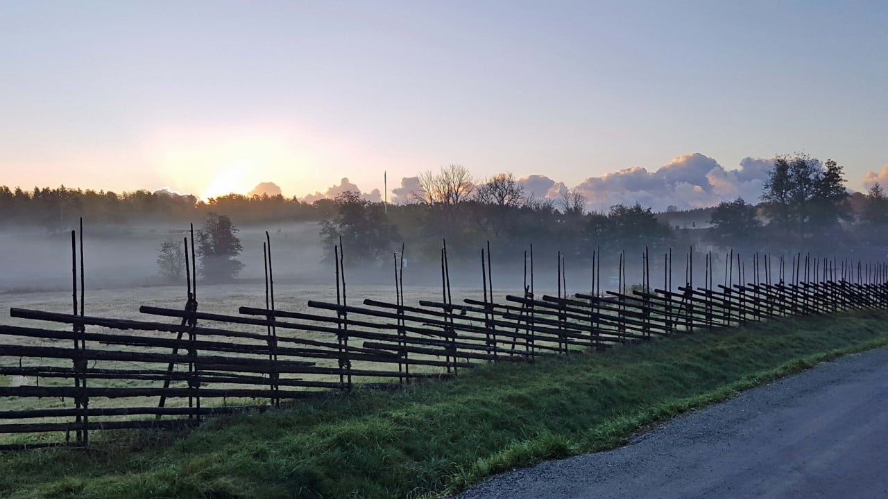 En fint komponerad höstbild tagen strax innan solen tittar fram och värmer bort dimman.