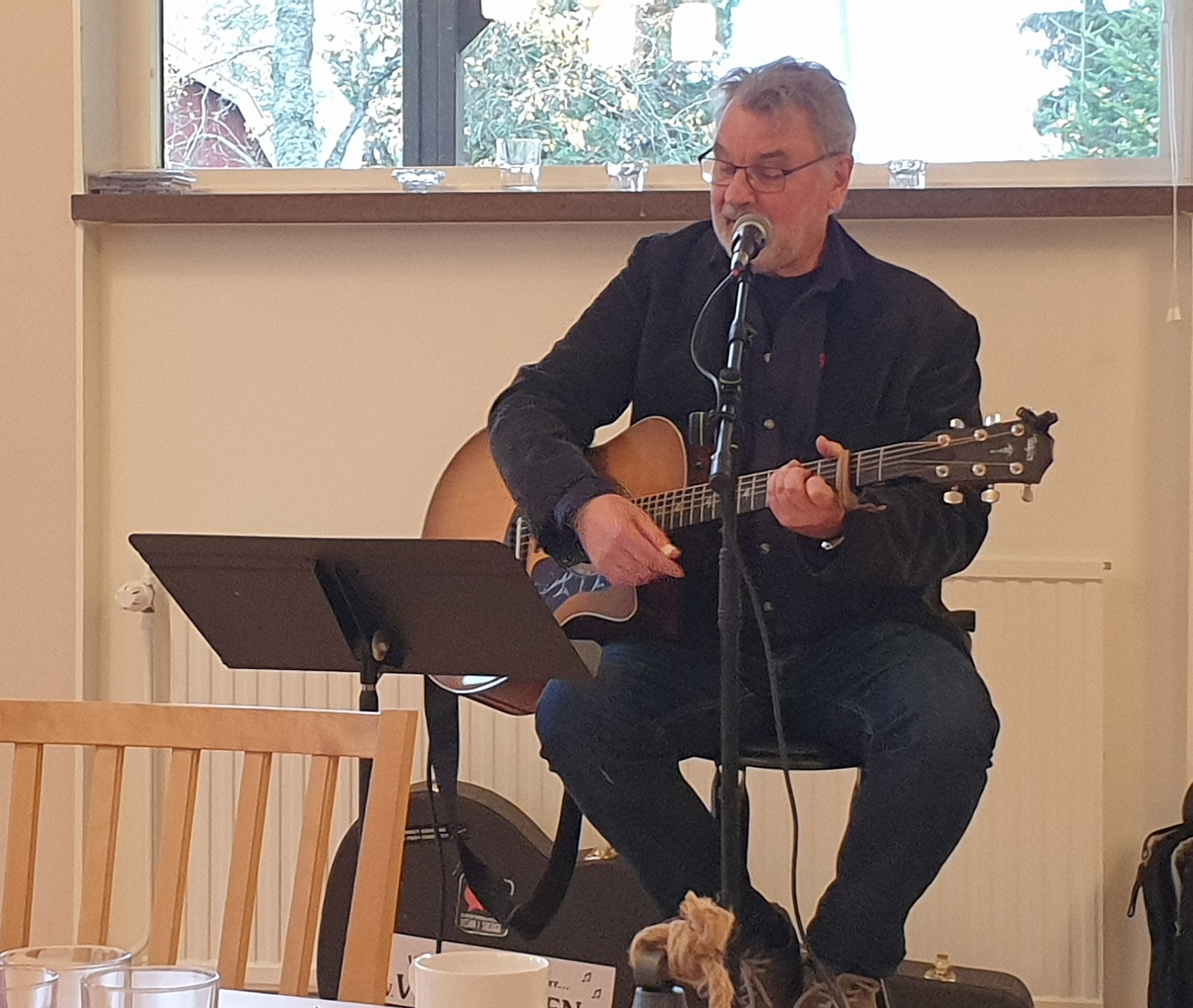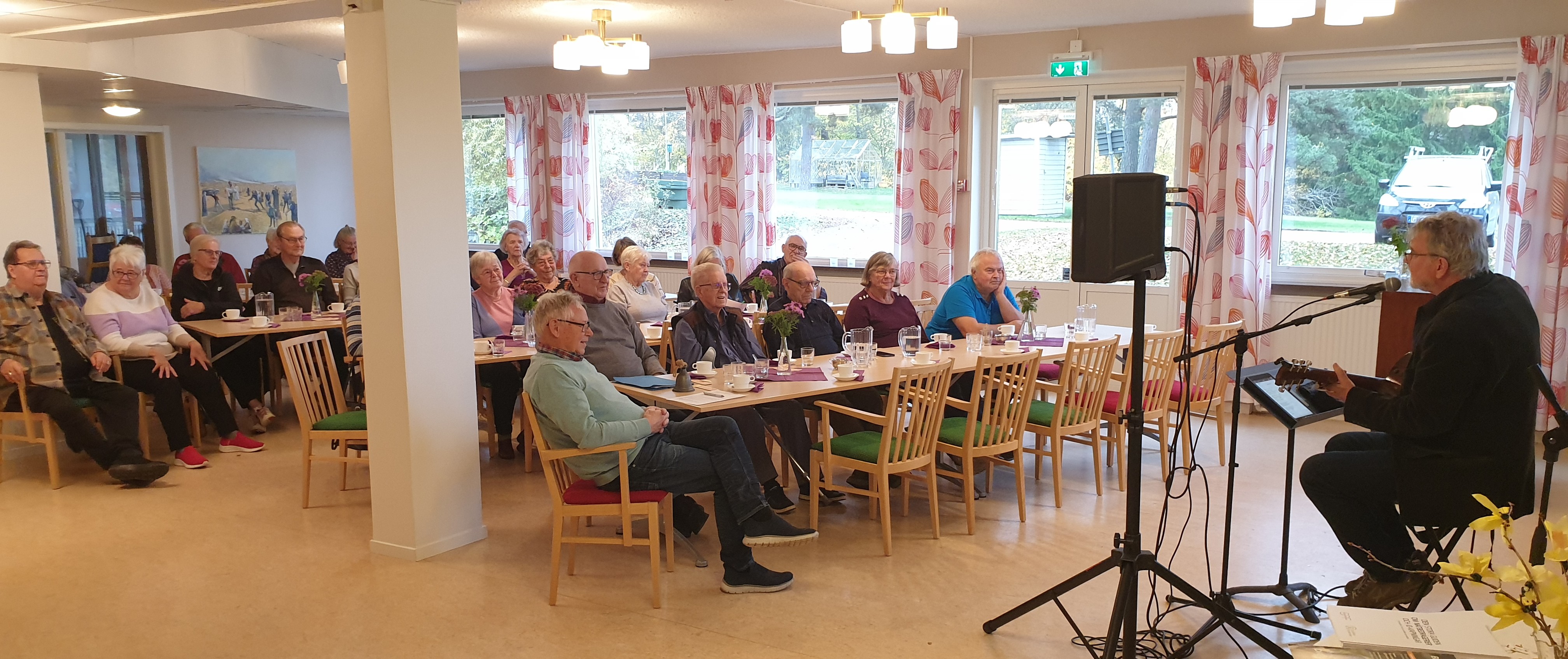 Nu till dagens höjdpunkt, de drygt 30 tal SPF seniorer Grillby, kom till Tallgården för att lyssna på trubaduren Gunnar Törngren som är en duktig vismakare och musiker. Vi satt som tända ljus när han framförde både egna och andras låtar till gitarrmunspel.