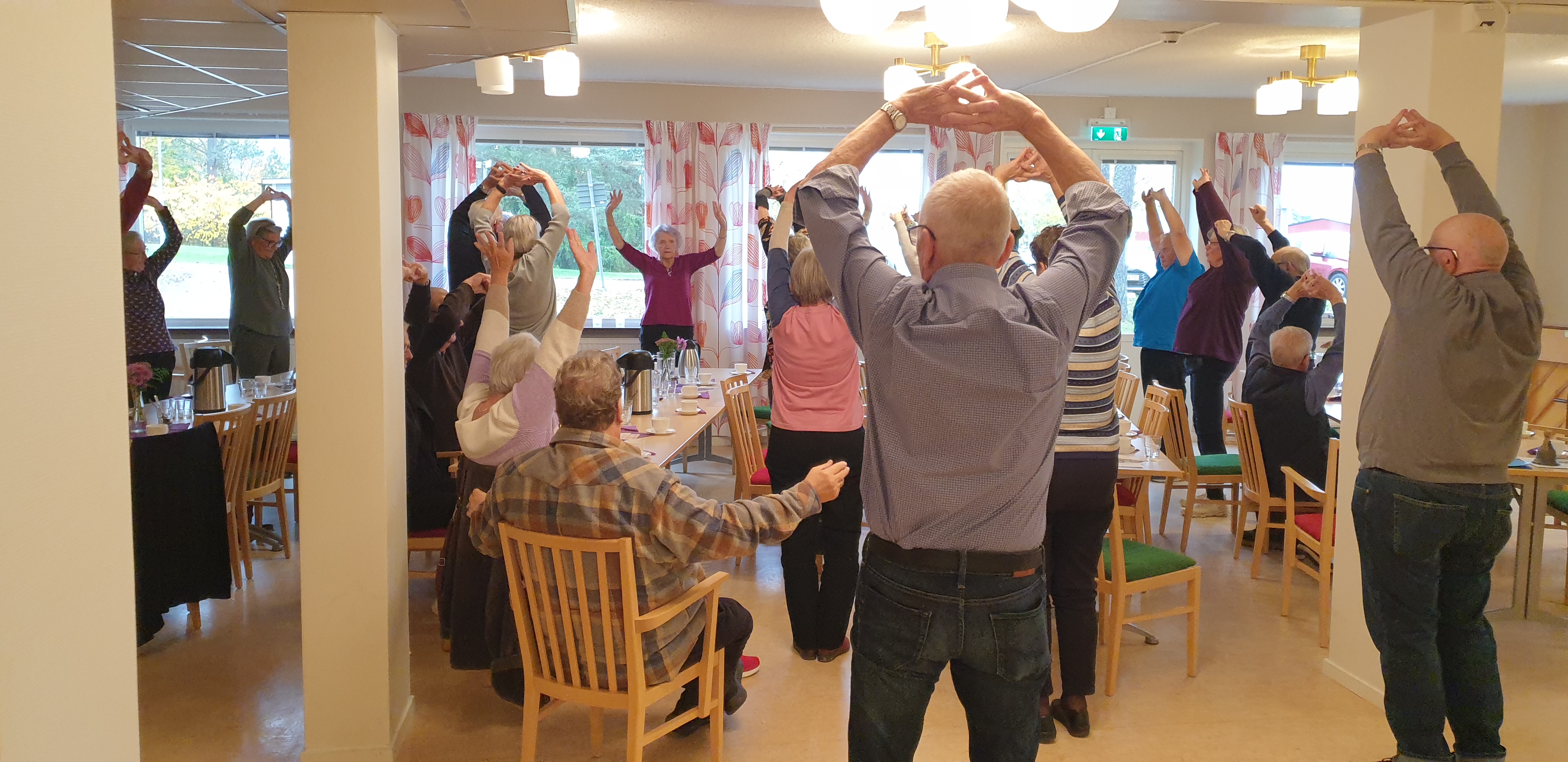 Dags för en arm och bensträckare under ledning av Barbro Rosqvist. Skönt att få igång blodcirkulationen i benen igen innan kaffepausen, som satt fint nu med allt fint som kaffegruppen dukat upp med. Nu fick vi tillfälle att lösa alla livets problem över en kopp fika. Allt om väder, världsläget, sjukdomar, ja det är inte klokt vad vi kan prata. Nu bjöd vår trubadur på ett extranummer innan lotteriet drog igång, där bland annat äpplen från Säby frukt, och blommor, samt hembakat bröd m.m. gick åt som smör i solsken.
