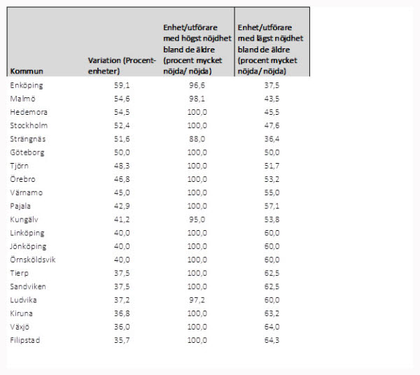 Skillnaderna i hur nöjda äldre är med hemtjänsten kan vara stora – även inom samma kommun. I genomsnitt skiljer det 18 procentenheter i nöjdhet mellan olika hemtjänstenheter i samma kommun. Det innebär att upp till 90 procent av de äldre kan vara nöjda vid en hemtjänstenhet, medan bara 72 procent är nöjda vid en annan enhet i samma kommun. I några kommuner är skillnaden över 50 procentenheter.