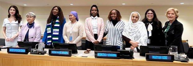 Bild av panelen från seminariet om rättvisa över generationsgränser som Maria Larsson modererade. Kvinnorna som deltog kommer från Pakistan, Sierra Leone, Mongoliet, Filippinerna och Kenya.