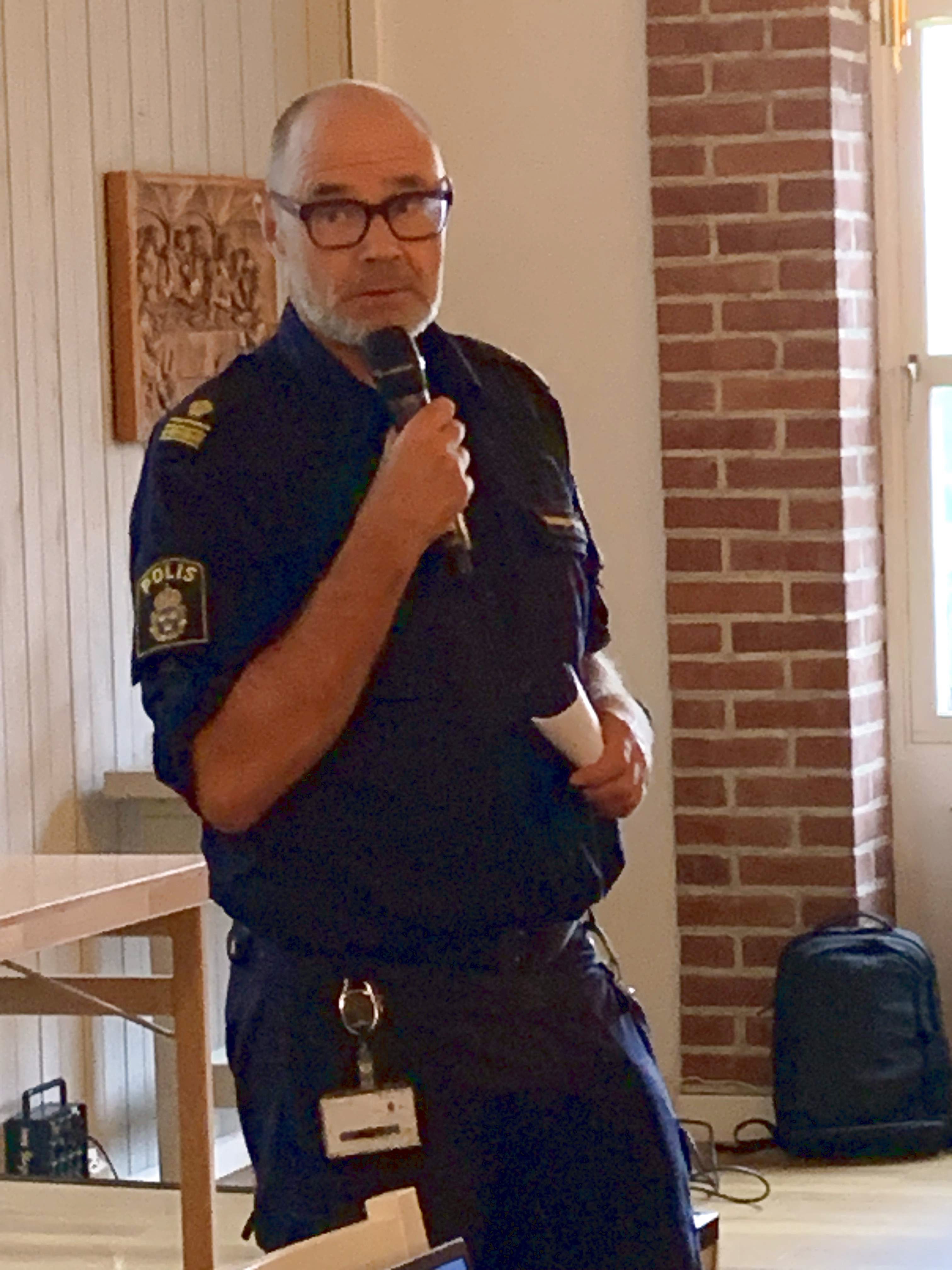 Först visade Staffan Käll statistik över bl.a bedrägerier, stölder och narkotikarelaterade brott, som skett i Älmhult de senaste åren. Han fortsatte med att ge tips på vad man måste tänka på, för att inte bli drabbad. När det gällde bedrägerierna ska man ju absolut inte uppge t.ex sitt Bank-ID, inte heller lämna ut koder, nummer m.m. på bankkort. Eftersom det är många som ringer och luras för att få ut dessa nummer, ska man bara avsluta dessa samtal. Det finns inga banker, affärer eller myndigheter som kräver dessa uppgifter!