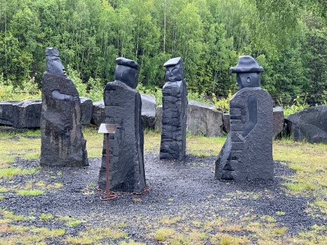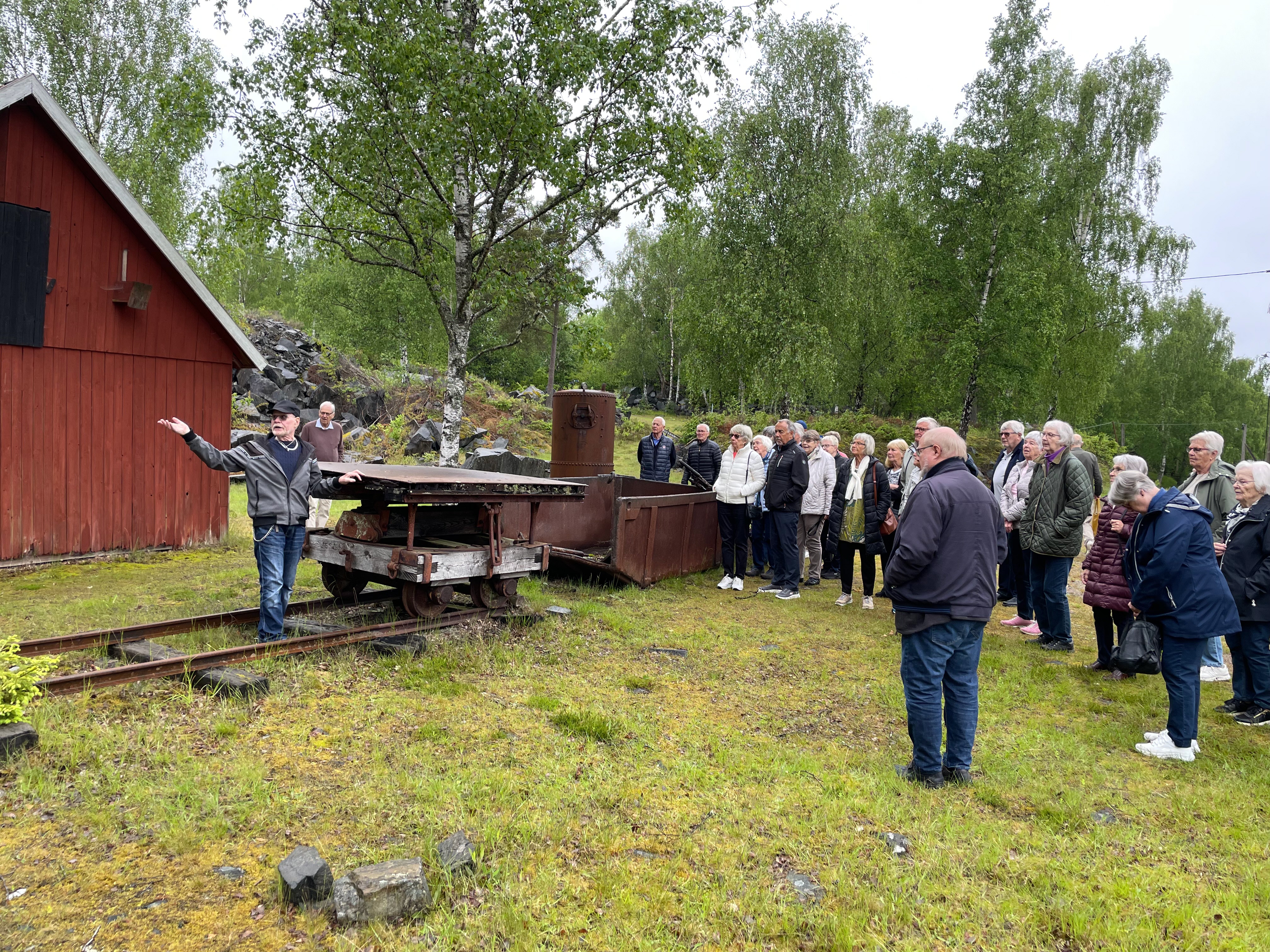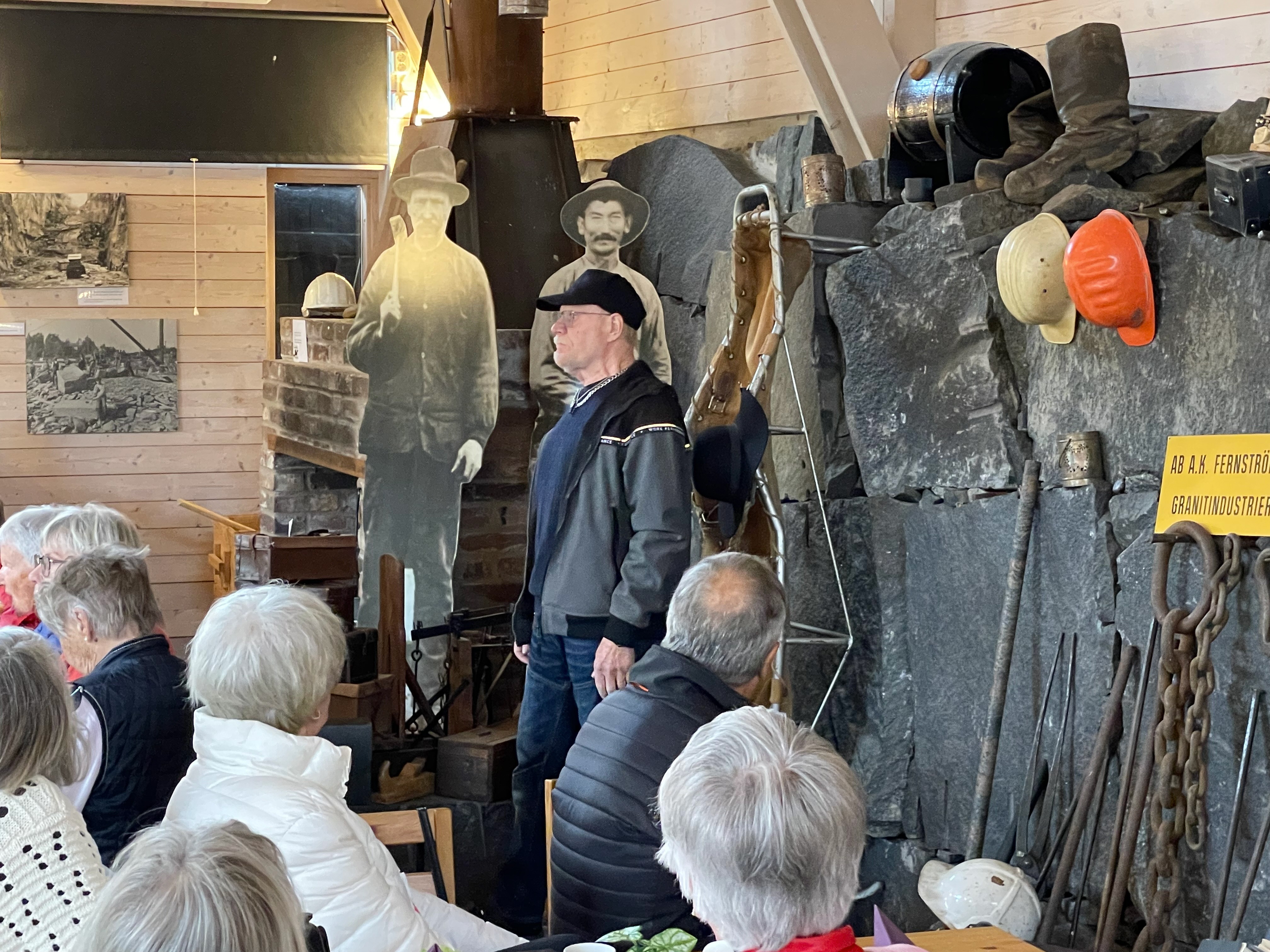 Första stoppet blev vid det stora diabasbrottet "Svarta Bergen" i Lönsboda. Anders Björnsson berättade om hur stenbrytningen gått till. Här blev det också förmiddagsfika.