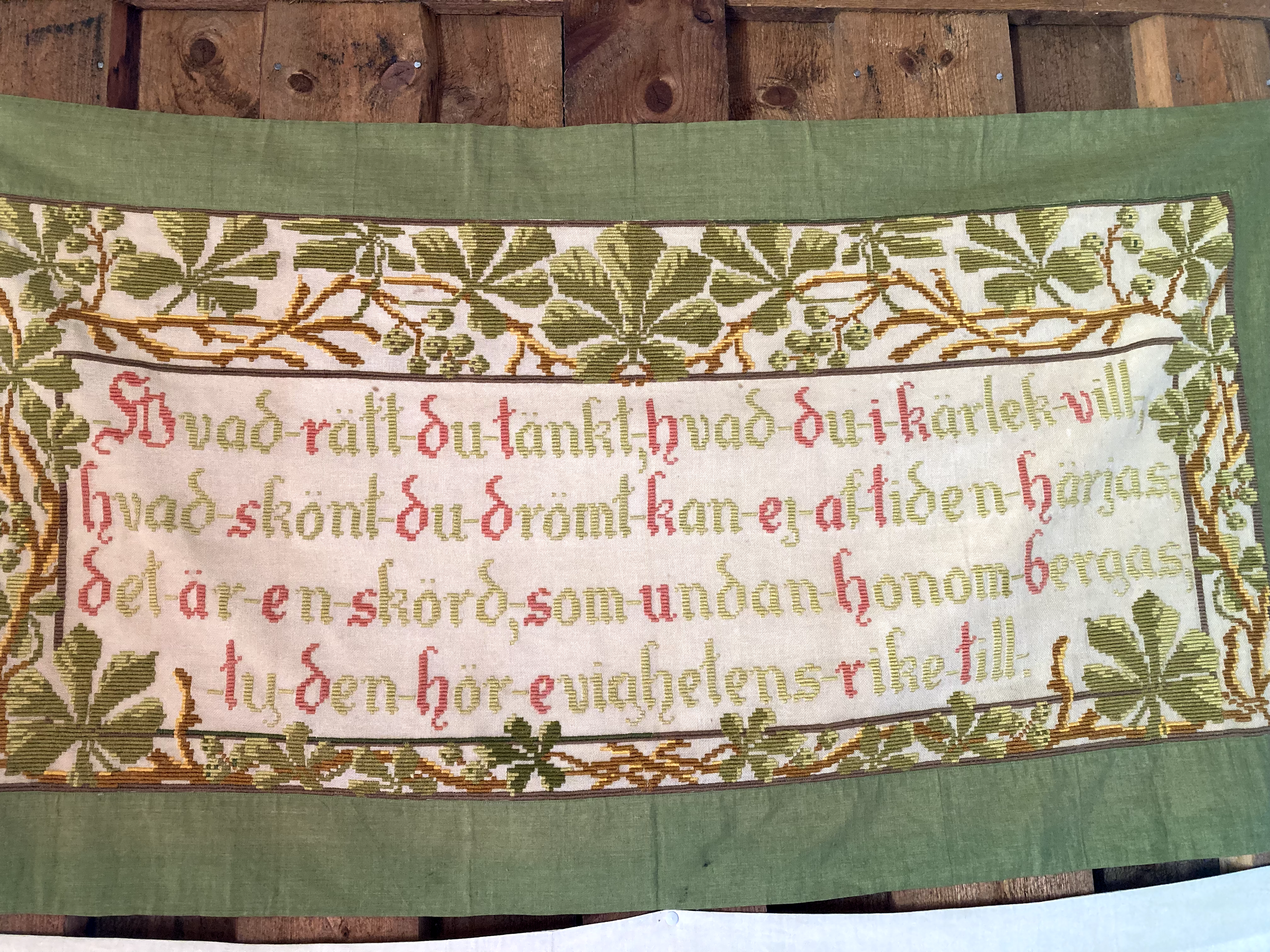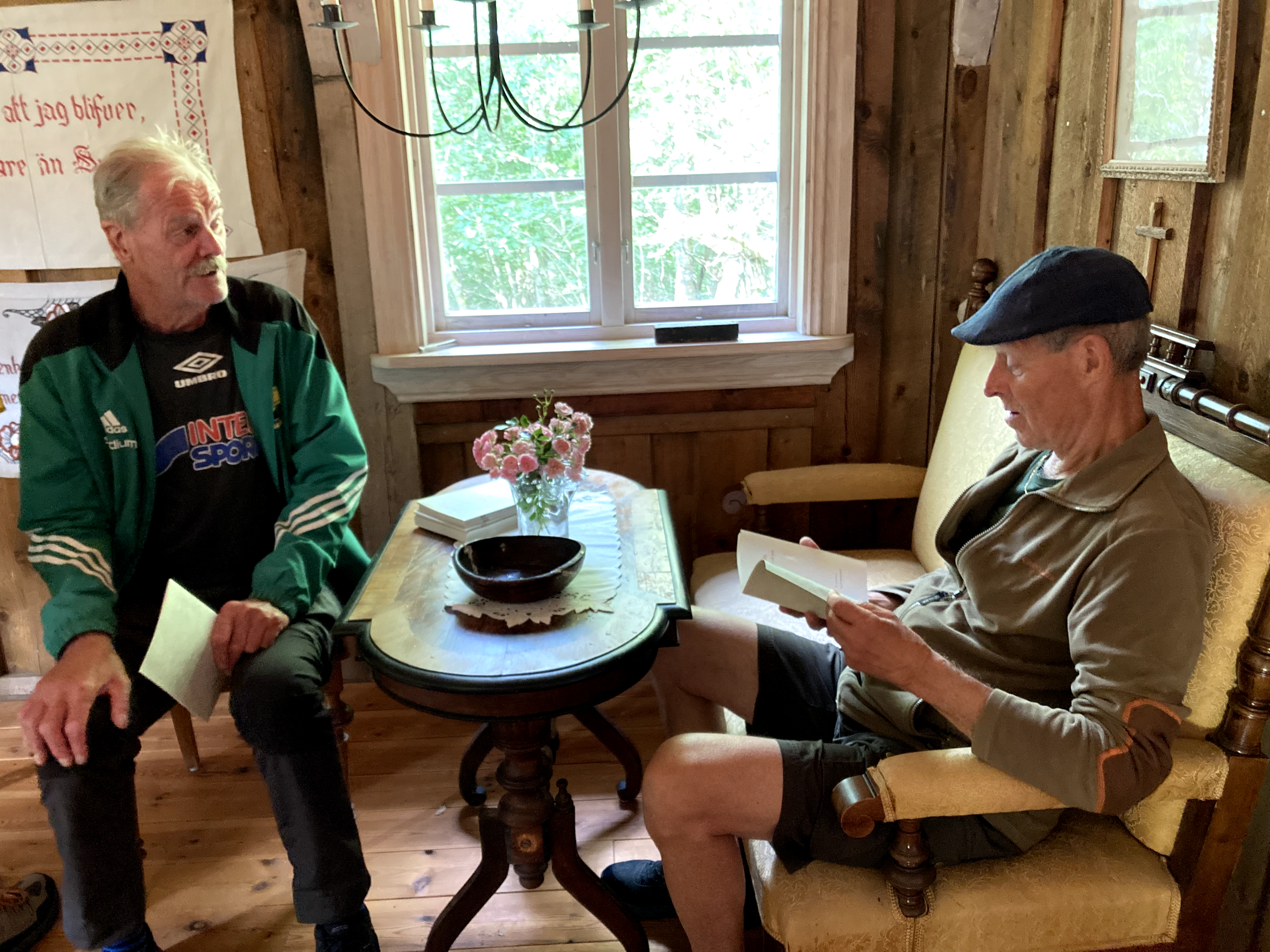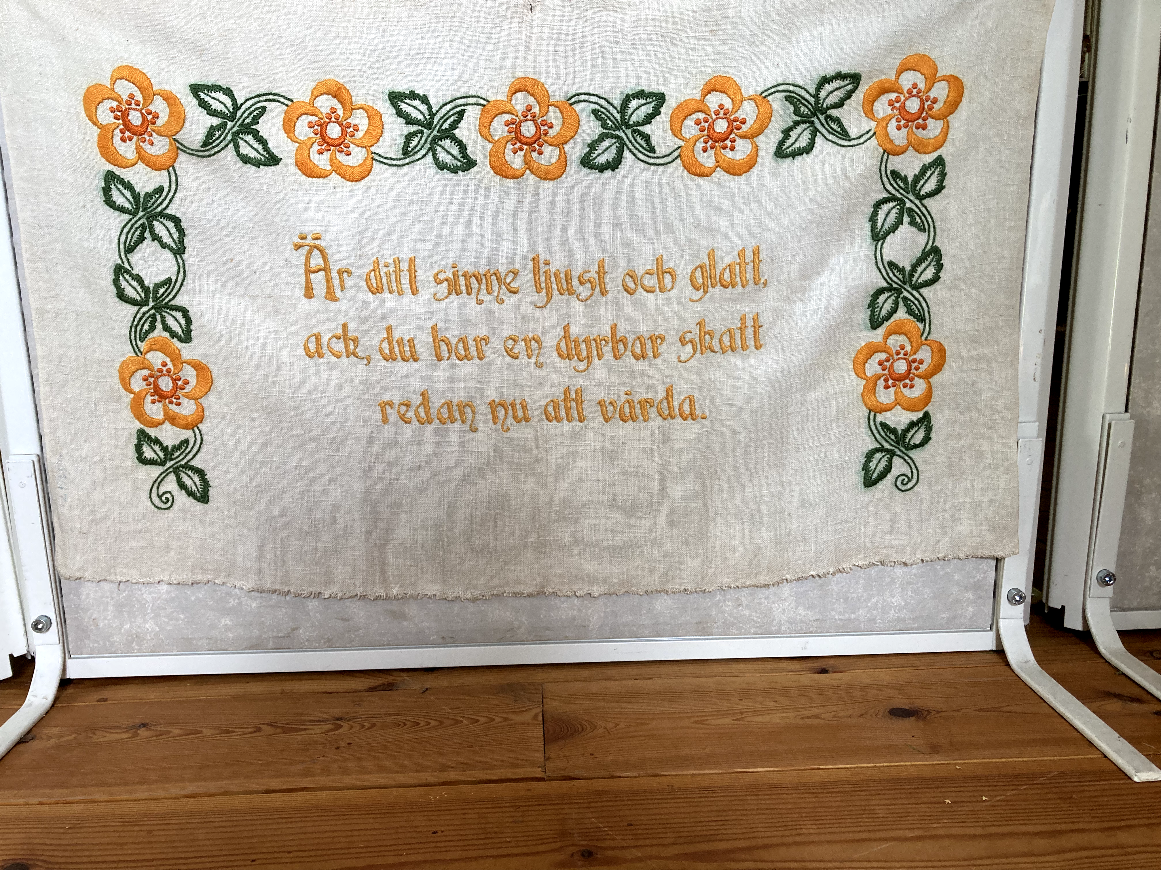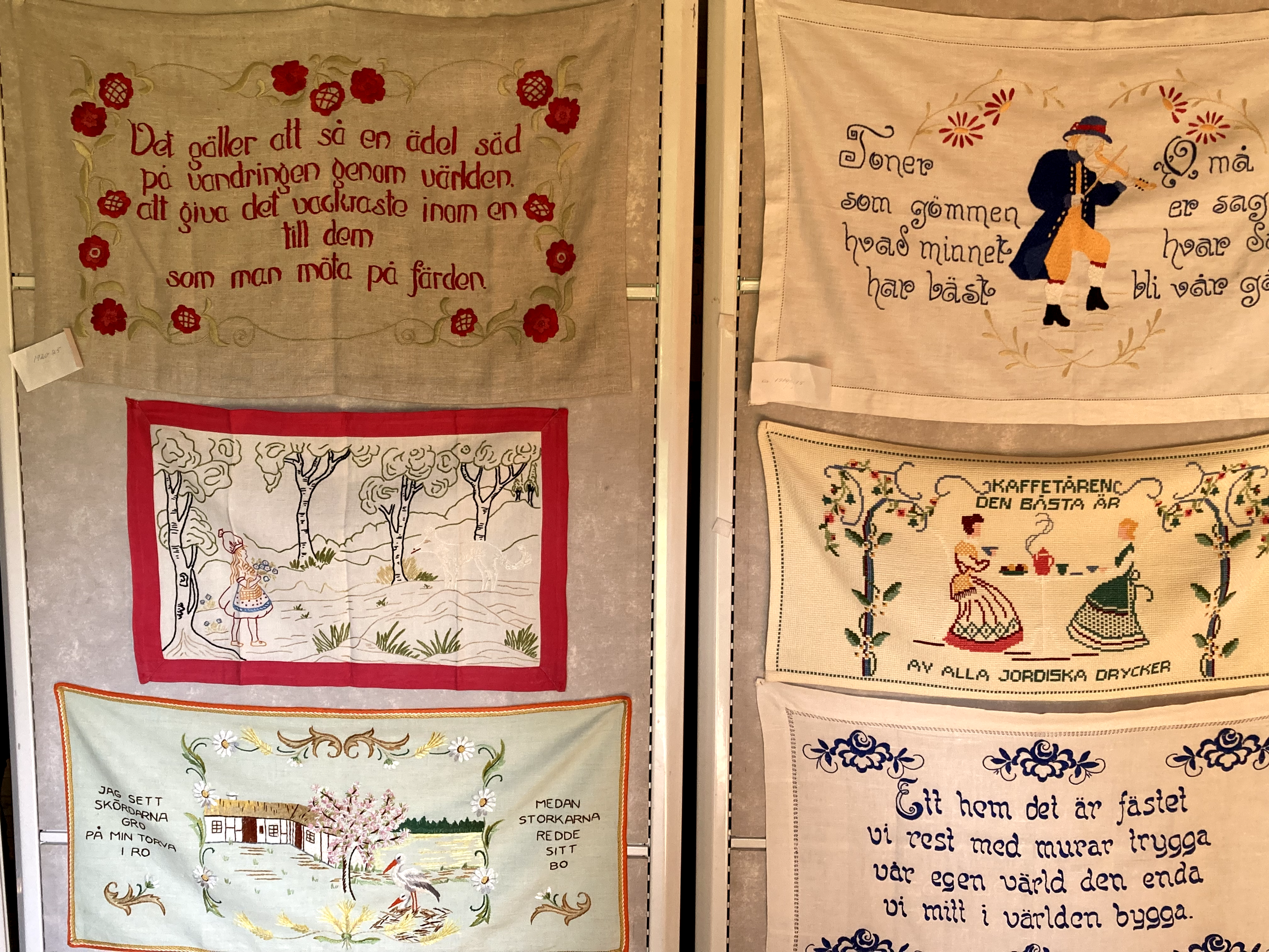 Idel nya mål, Källshults hembygdsgård där förutom kortare promenad kunde titta på en utställning av gamla broderade bonader. Vi bedökte Tildas stuga och tittade in i det riktigt gamla ladugården. Hembygdsföreningens ordförande, Margareta liksom föreningens kassör, Marie berättade mycket inlevelsefullt och intressant om Tilda liv och leverna.