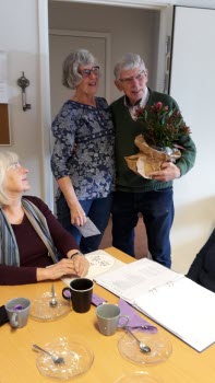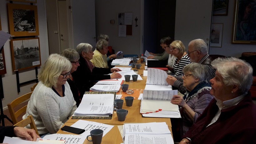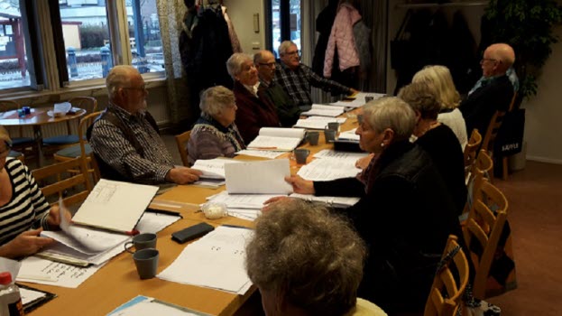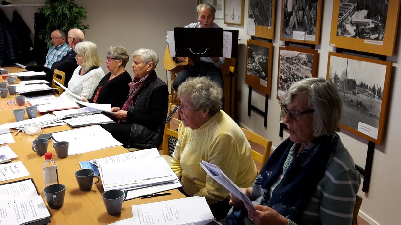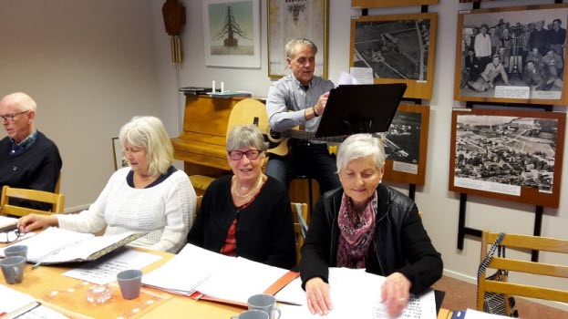 Sånggruppen med Björn Sving och Lars Ohlsson övar i Träffpunkten. våren 2017.