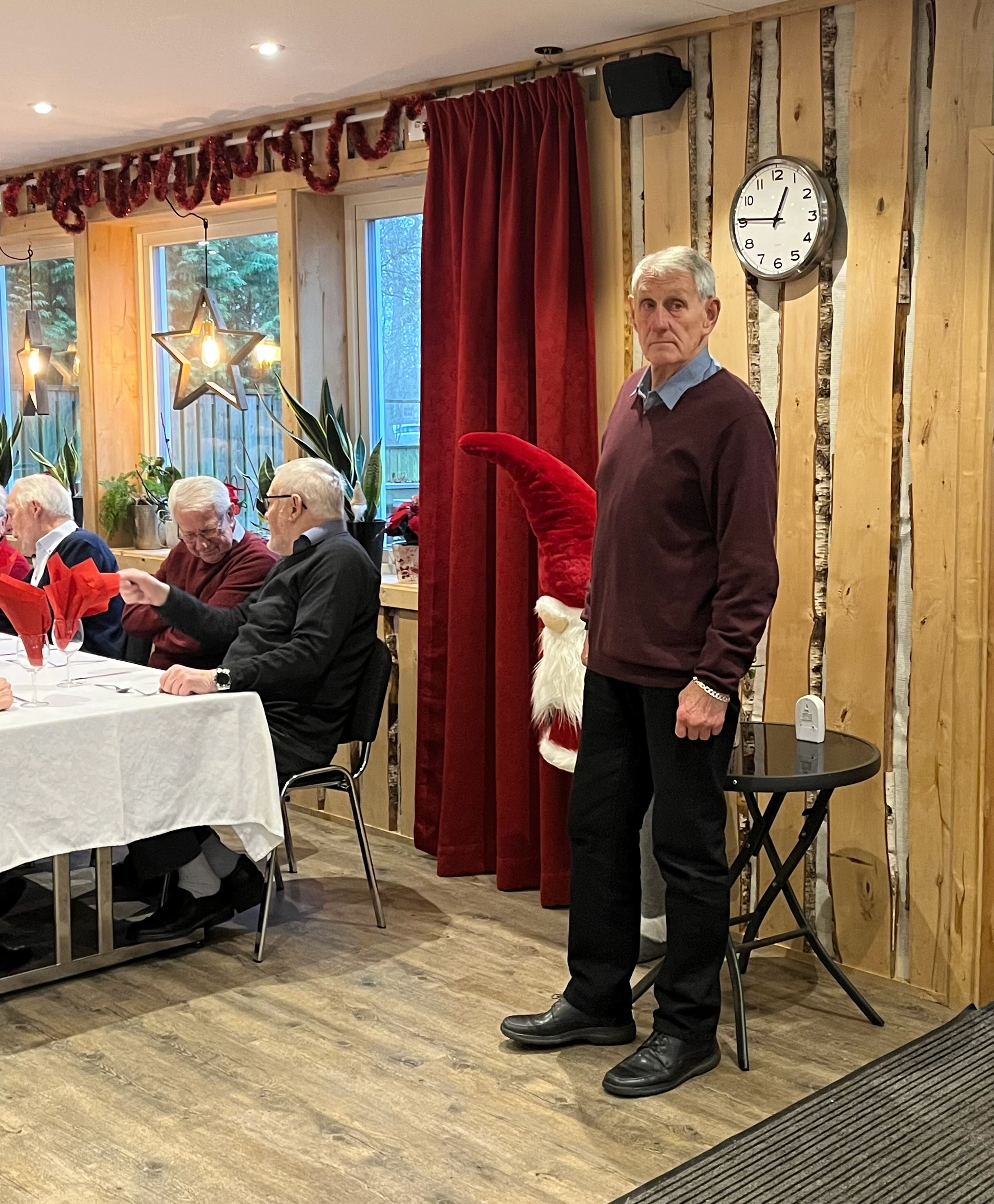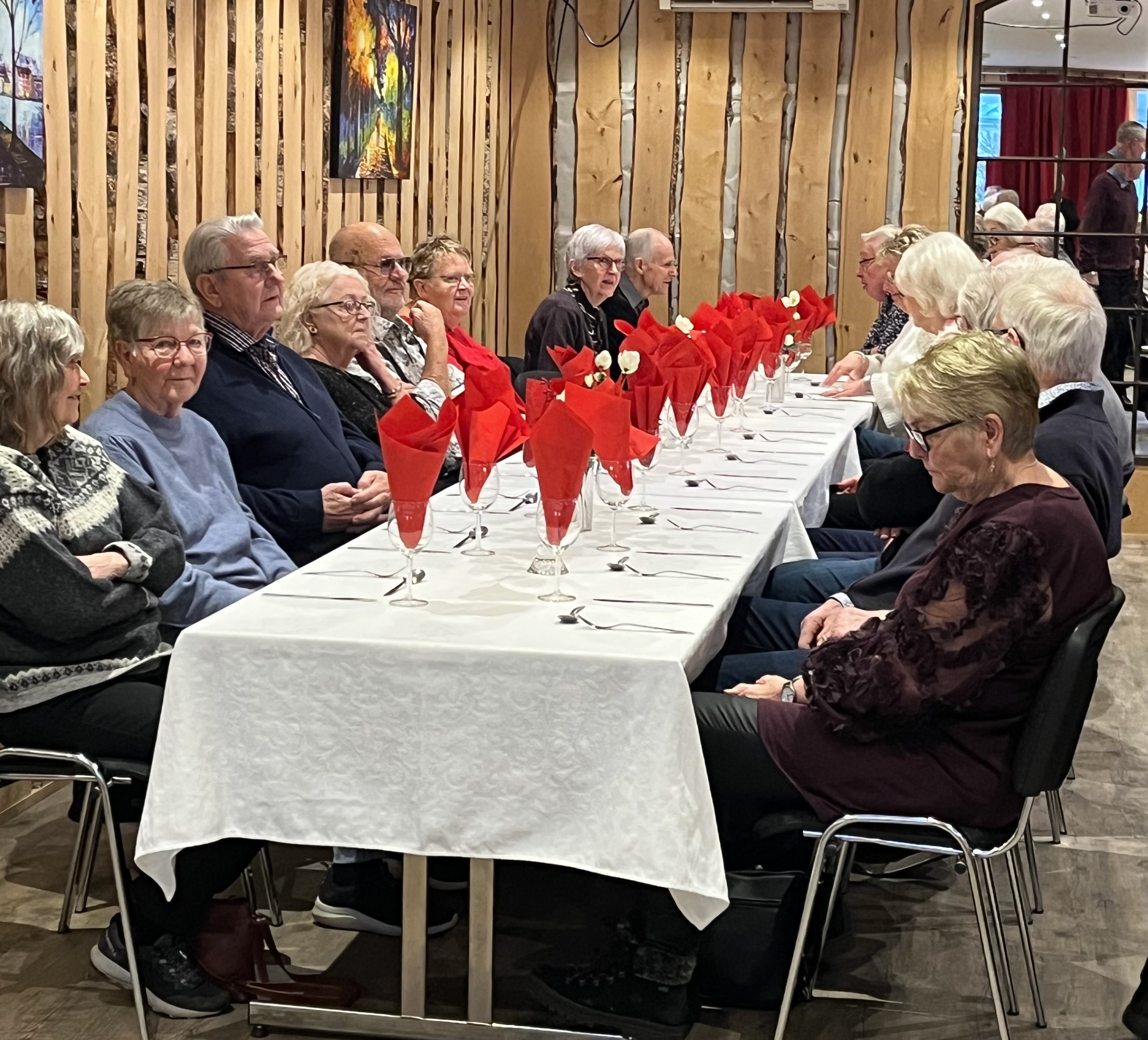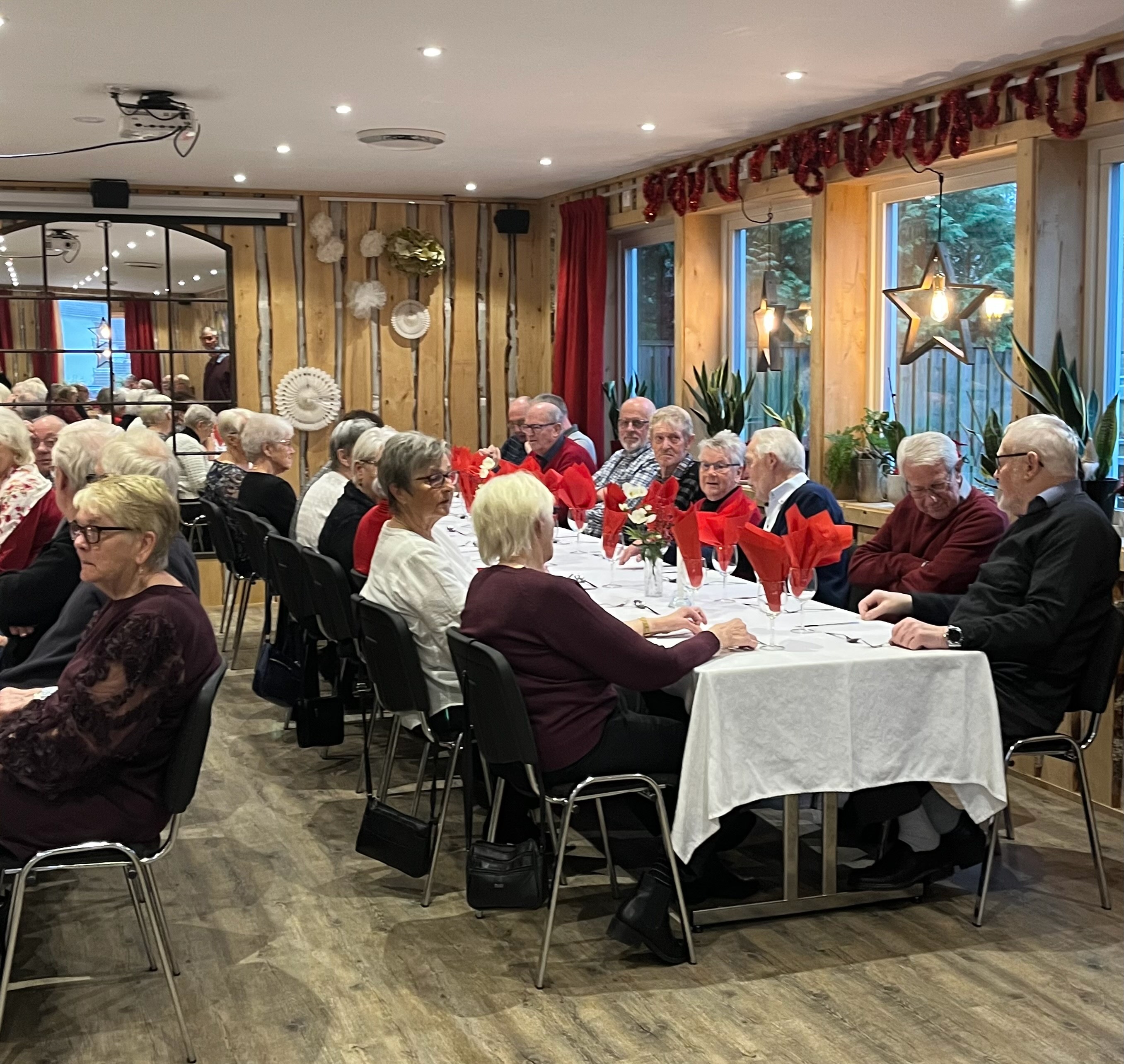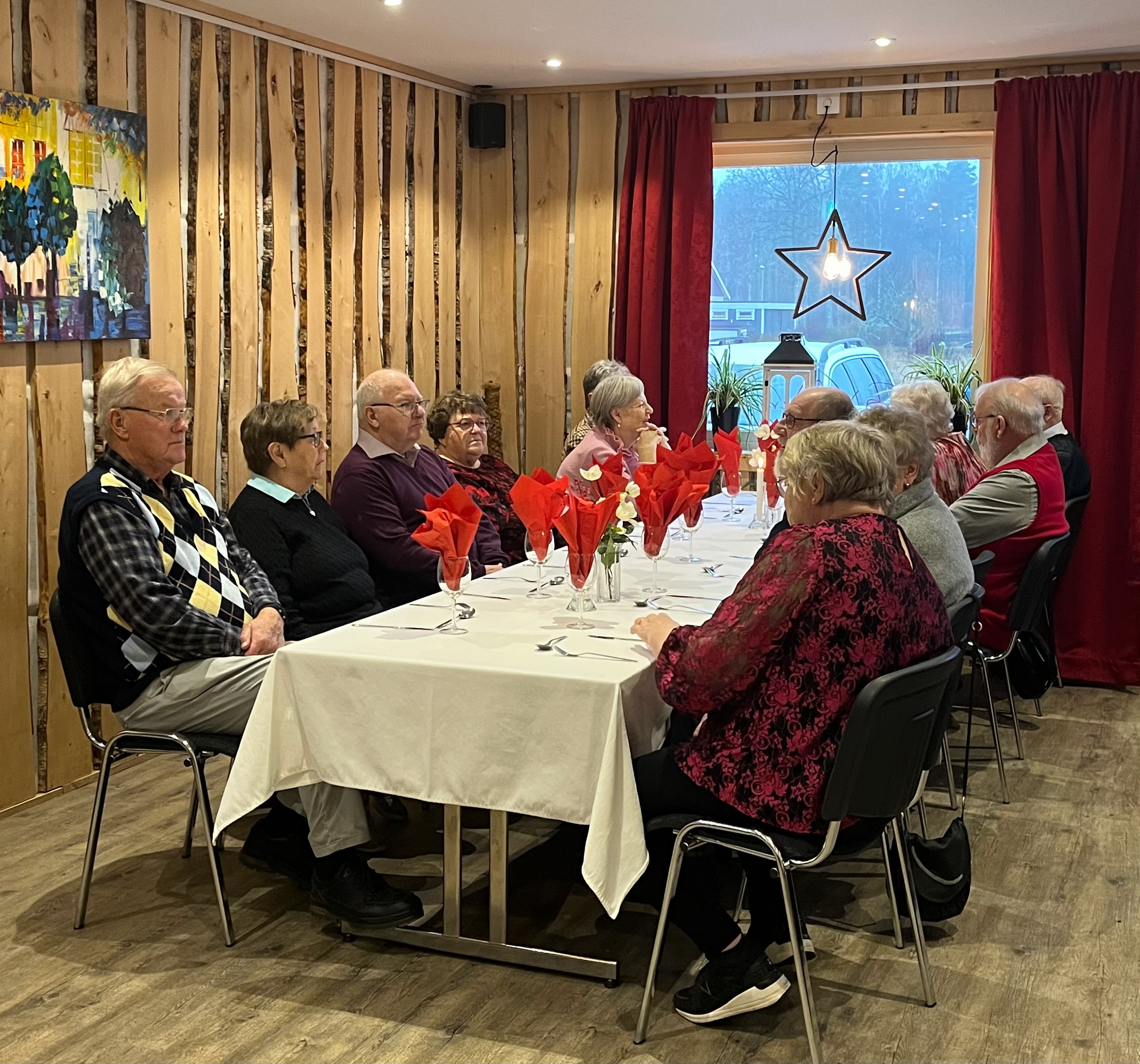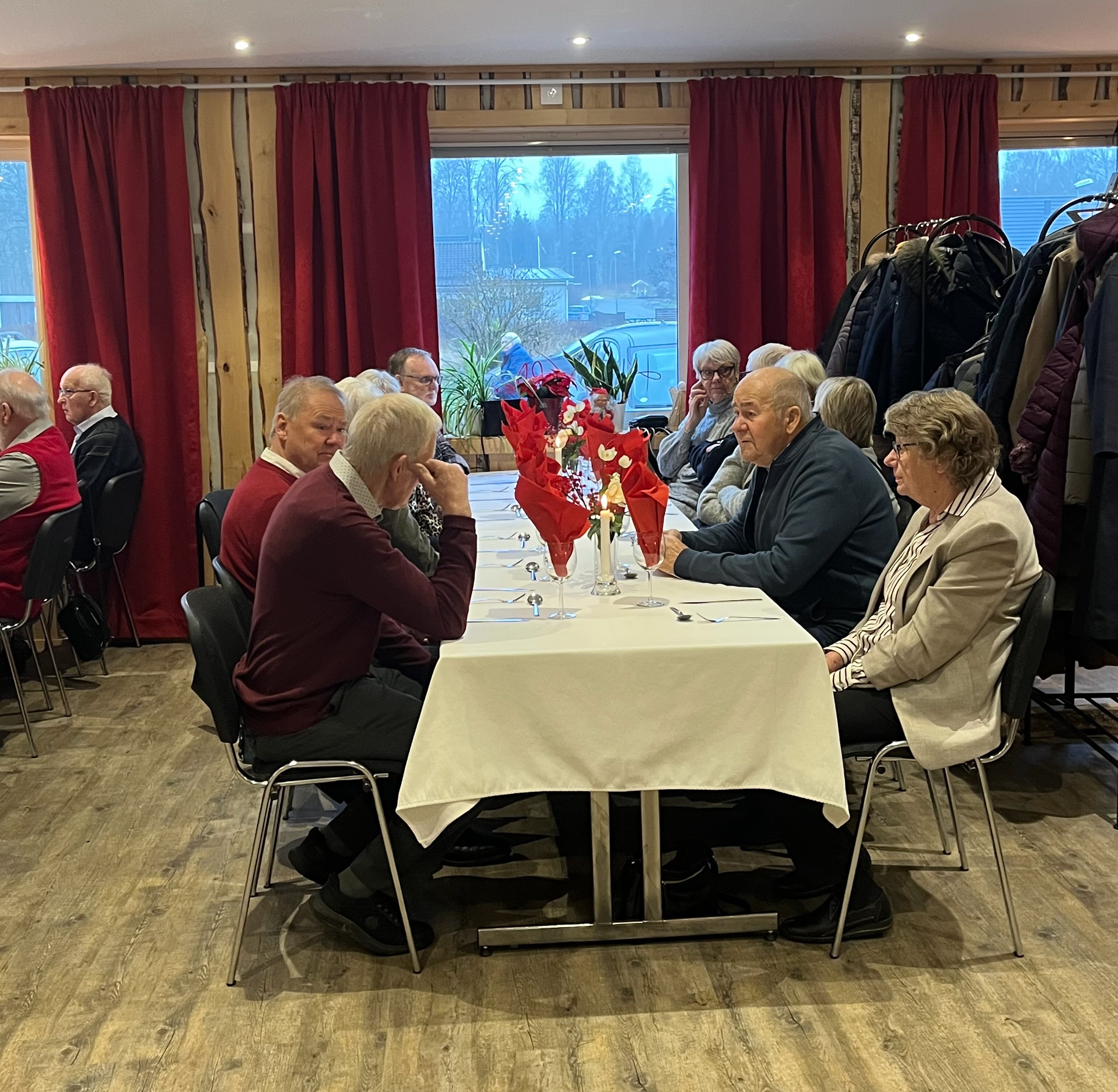 Klockan 13 satt vi alla 57 bänkade och förväntansfull för att få hugga i av allt det goda som var framdukat. Det vill jag lova, det var jättegott alltihopa. De hade också gjort riktigt julfint med röda gardiner, röda servetter,vita dukar och tomtar lite varstans. Efter en riktigt god måltid med många trevliga samtal, åkte nog alla hem mycket nöjda med dagen. /Iréne Andersson