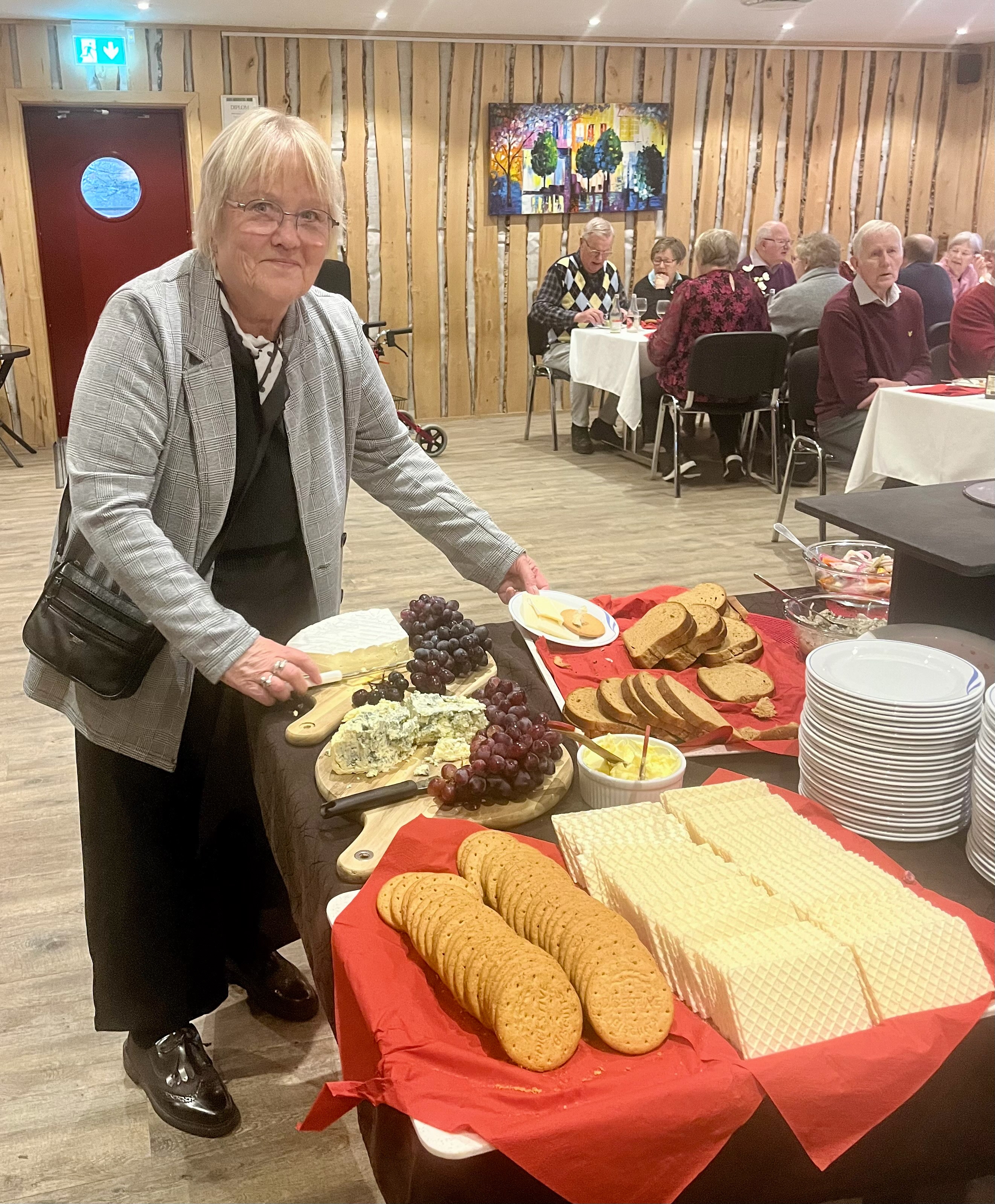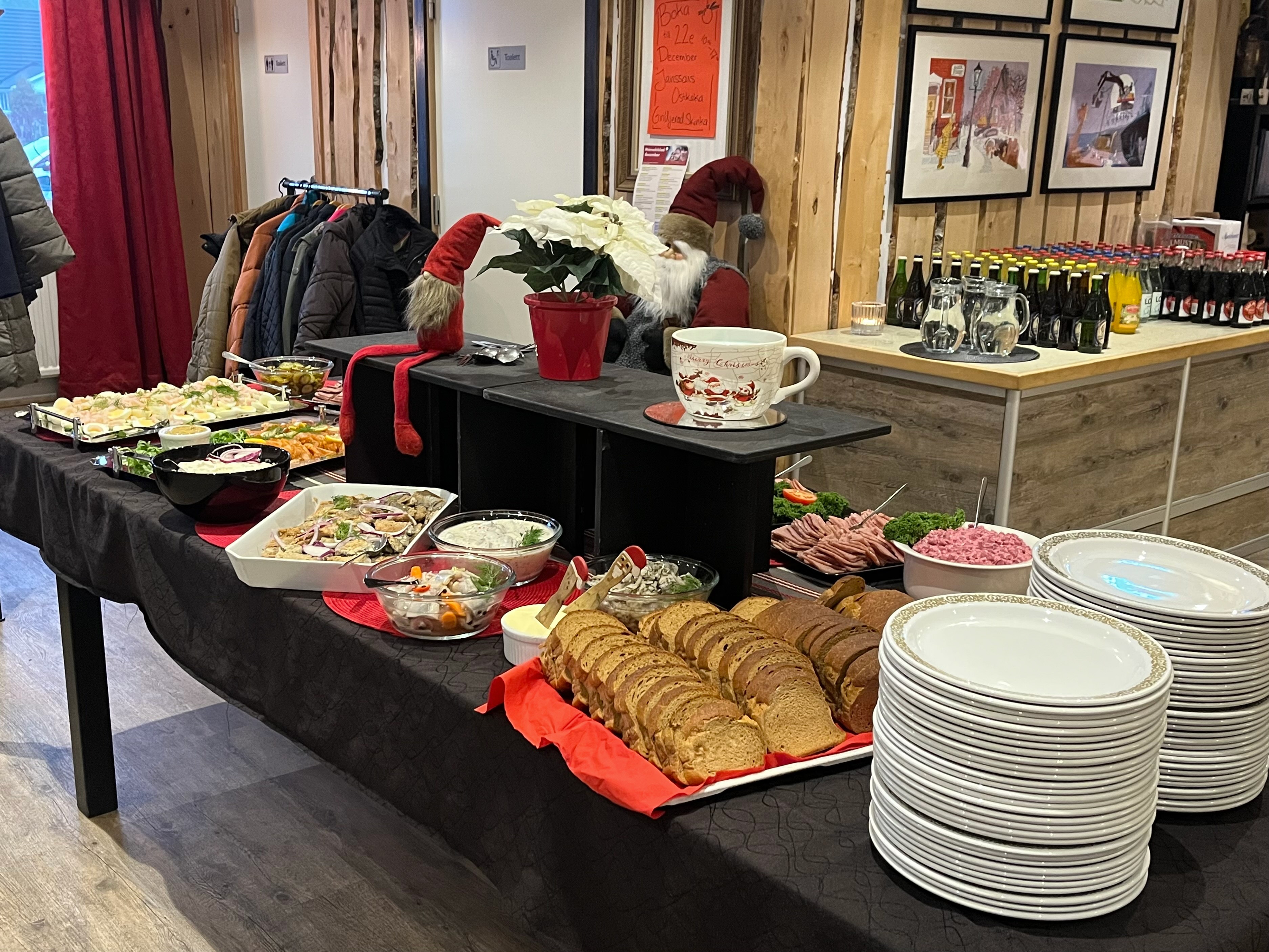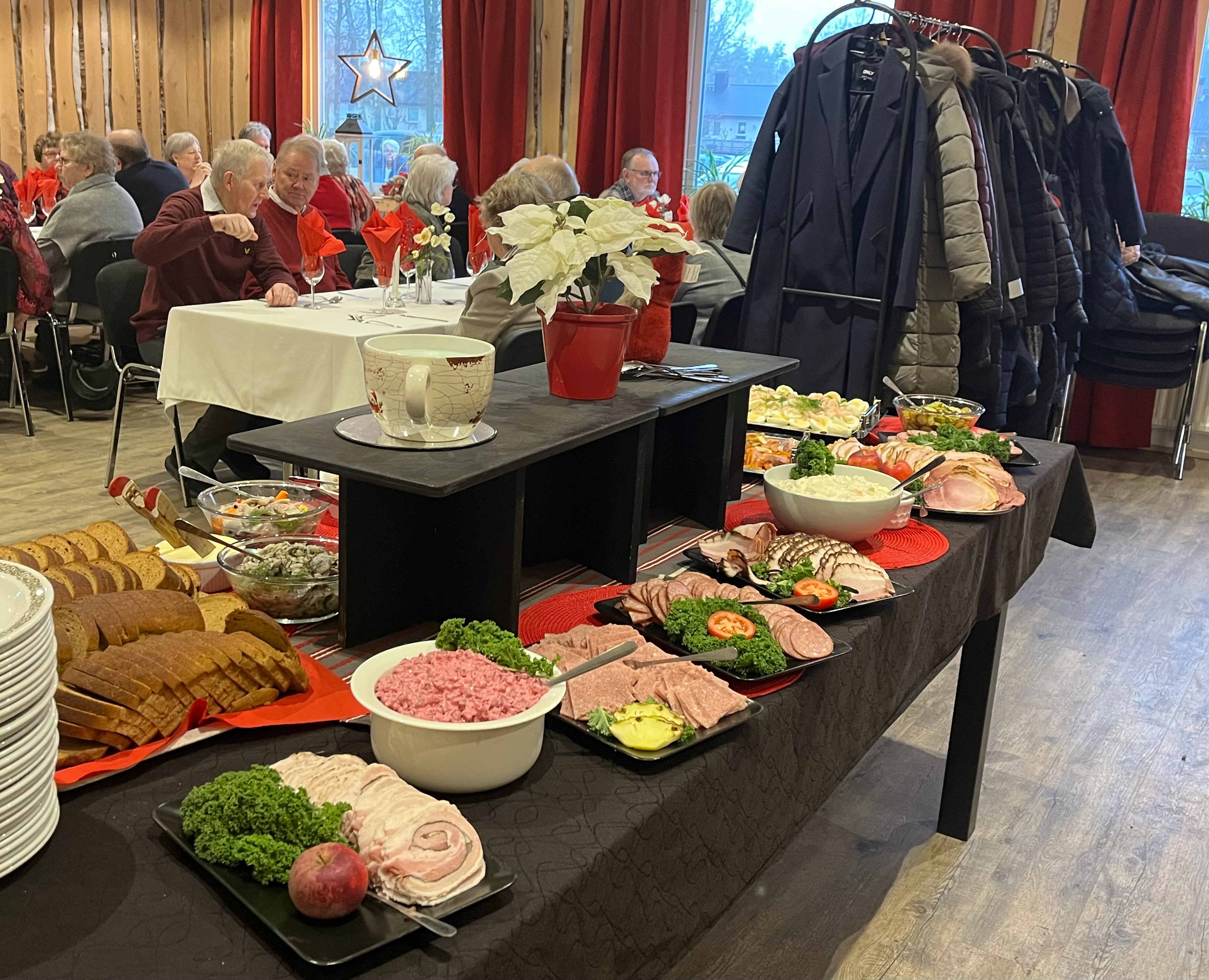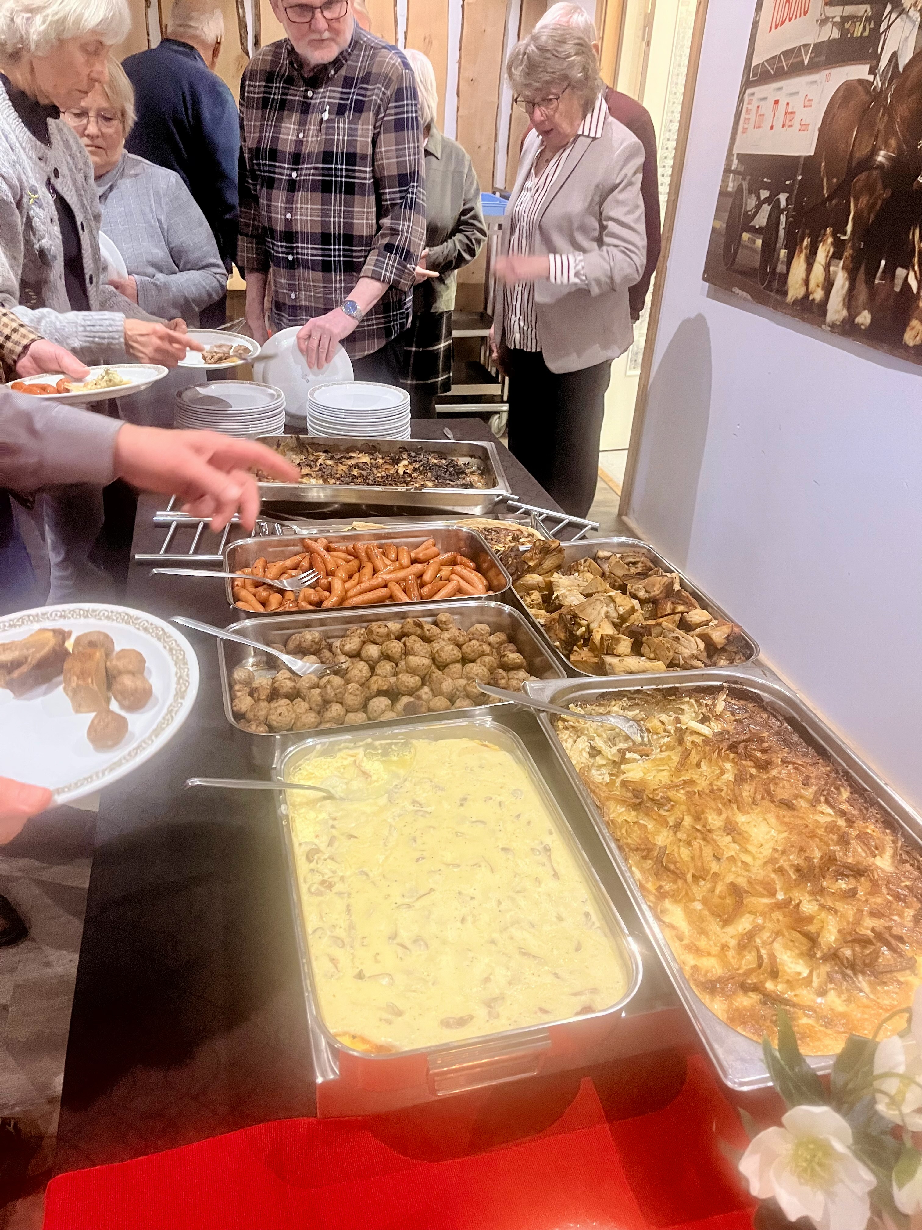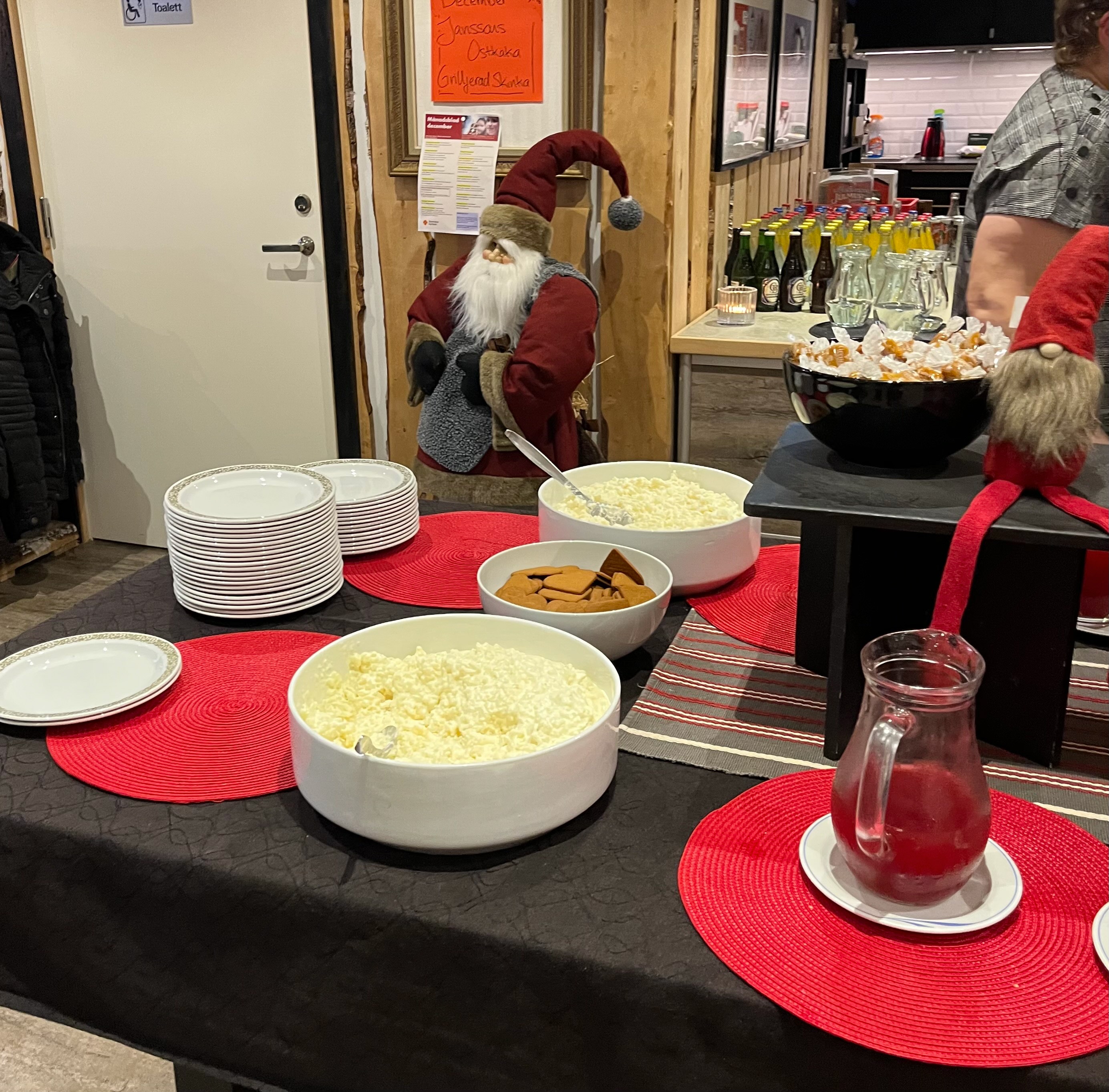 Klockan 13 satt vi alla 57 bänkade och förväntansfull för att få hugga i av allt det goda som var framdukat. Det vill jag lova, det var jättegott alltihopa. De hade också gjort riktigt julfint med röda gardiner, röda servetter,vita dukar och tomtar lite varstans. Efter en riktigt god måltid med många trevliga samtal, åkte nog alla hem mycket nöjda med dagen. /Iréne Andersson