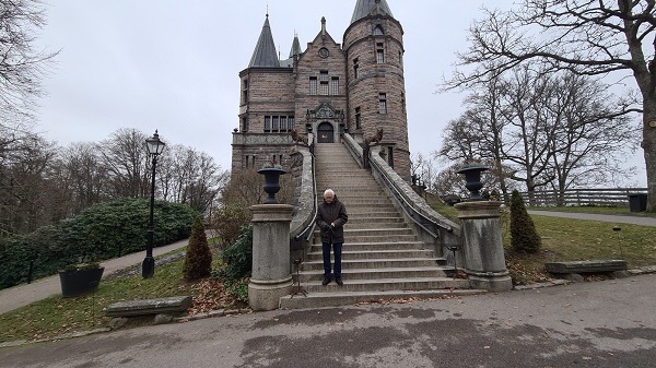 Därefter blev vi informerade av en ung man som rappt berättade om slottets tillkomst i början av 1900 talet och om dess snabba bygg tid. Byggherre var släkten Bonde. Slottet beboddes av byggherren under den första tiden och genomgick sedan många skepnader. Till slut köpte Växjö kommun slottet för en krona och till hörande stora områden för några få miljoner. Detta lär vara en av Växjö kommuns bästa affärer.