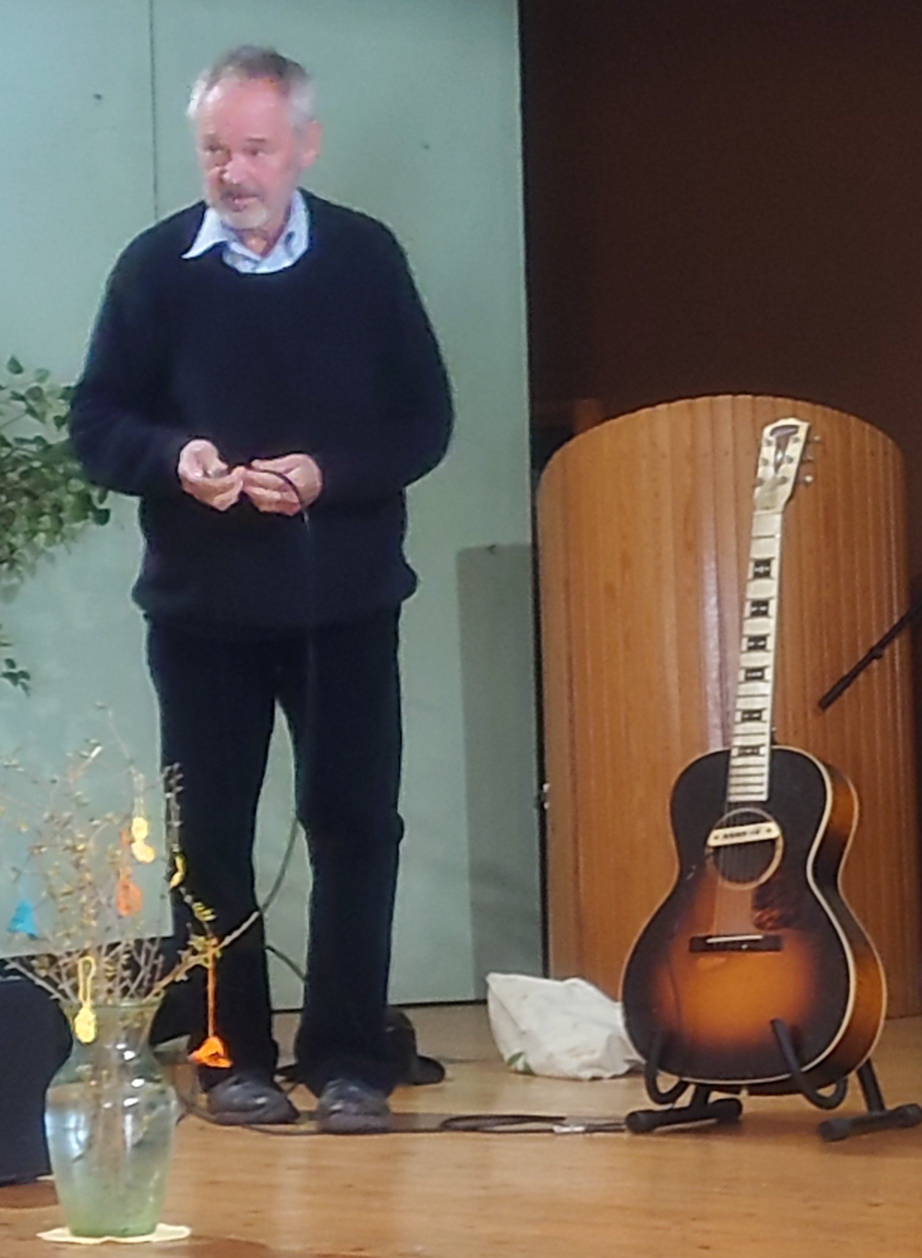 Innan ostkaka och kaffe underhöll Mats Sturesson på redig småländska med skillingtryck och gitarrspel. Många glada skratt hördes från publiken.