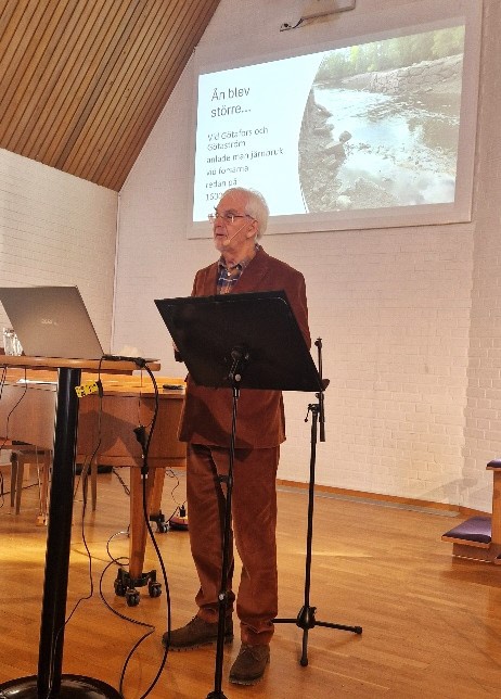 Estradörerna intog scenen och Sölve berättade att i 100.000 år låg ett 3 km tjockt istäcke över Ljungby och efter 20.000 år började det att smälta och efter 10.000 år var isen borta. Smältvattnet bildade bäckar, åar och floder. En av dessa var ursprunget till ån Lagan. Sölve sjöng en strof på Allan Edwalls visa ”Den lilla bäcken”. Längs ån blev det naturligt med bosättningar och människor kunde försörja sig dels på vad ån gav, dels på jord- och skogsbruk. Sölve visade bilder på bl.a. timmerflottning och sågverk. Ån utgjorde även en viktig transportled för både gods och människor. Att binda samman de olika områdena i Ljungby med broar var förstås viktigt. Det byggdes flera kraftverk utmed Lagan under 1900-talet och Sölve berättade att Ljungby kraftverk invigdes år 1910. Ån bjöd inte bara på nyttigheter, utan i Hembygdsparken kunde man gå på dans, lyssna på musik och förlusta sig på olika sätt. Sölve visade en Ernst Rolf-affisch från 1962 och bjöd in allsång med några kända Rolf-låtar som ”Ju mer vi är tillsammans”, ”Bättre och bättre dag för dag”och ”De ä grabben med chokla i”. Sölve berättade om Aspudden, där det låg en dansbana och där kunde man även pröva den första vattenklosetten i Ljungby. I berättelsen om ån visar Sölve många fina bilder bl.a. på kallbadhuset med en pojk- och flickavdelning, och Ågubben, som står på gångstigen vid ”Hästhandlarbron”. I Lagan var vattnet på sina ställen gyttjigt och Sölve berättade om Möllebadet, där vattnet var särskilt gyttjigt. Man körde dit fin sand, men den blandades sig med gyttjan och det blev tyvärr ingen förbättring. Sölve fullföljde sin berättelse med att sjunga slutet på Allan Edwalls visa ”Lilla bäcken mot älven rinner, och älven rinner mot stora hav...” Avslutningsvis sjöng Sölve sin poetiska sång ”Här har vi levt...”