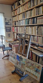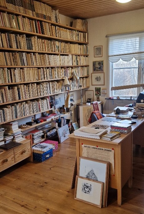 Vi gick sedan vidare in i huset (byggt 1969) och det var intressant att se deras vardagsrum, kök, sovrum mm. I hallen hängde en tavla som var Svens inträdesprov till Konstakademin. Det mest intressanta, tycker jag, var deras gemensamma arbetsrum med tusentals böcker och var sin skrivhörna.