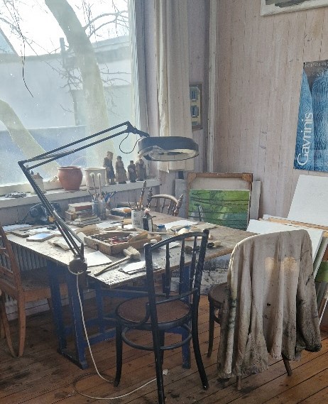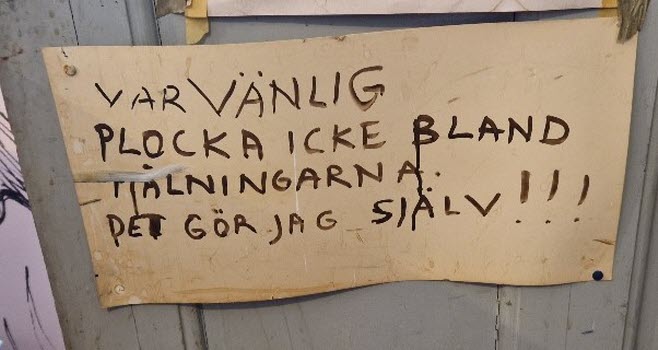 I Svens ateljé fick vi beskåda hur det kunde se bland alla målningar, penslar olika slags verktyg och lite skräp. Mest målade han ju ute på stan’ och i naturen i sin blå målarbod. Men när han målade i ateljén så var det ett motiv från just ateljén. Skylten som talar om att man inte ska rota bland hans tavlor – den är talande!