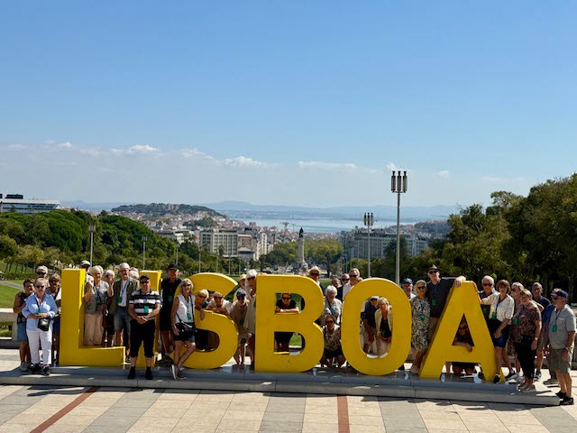 Sista dagen i Lissabon. Ledig förmiddag. Jag hade fått ett tips om en fin utsikt i närheten av vårt hotell. Jag vandrade uppåt och uppåt - och uppåt … men det lönade sig. En lätt lunch med en fantastisk utsikt, innan det var dags att träffa gruppen igen nere i stan. Bussen tog oss bl.a. till en annan fin utsiktsplats med en fontän inkl. en påminnelse om nejlikerevolutionen 1974. Vidare till Belém nere vid floden Tejo. Monument över sjöfararna, kopia på första flygplanet som flög över Atlanten 1922, Torre d. Belém och den fina bron. Härligt med varmt och soligt väder!