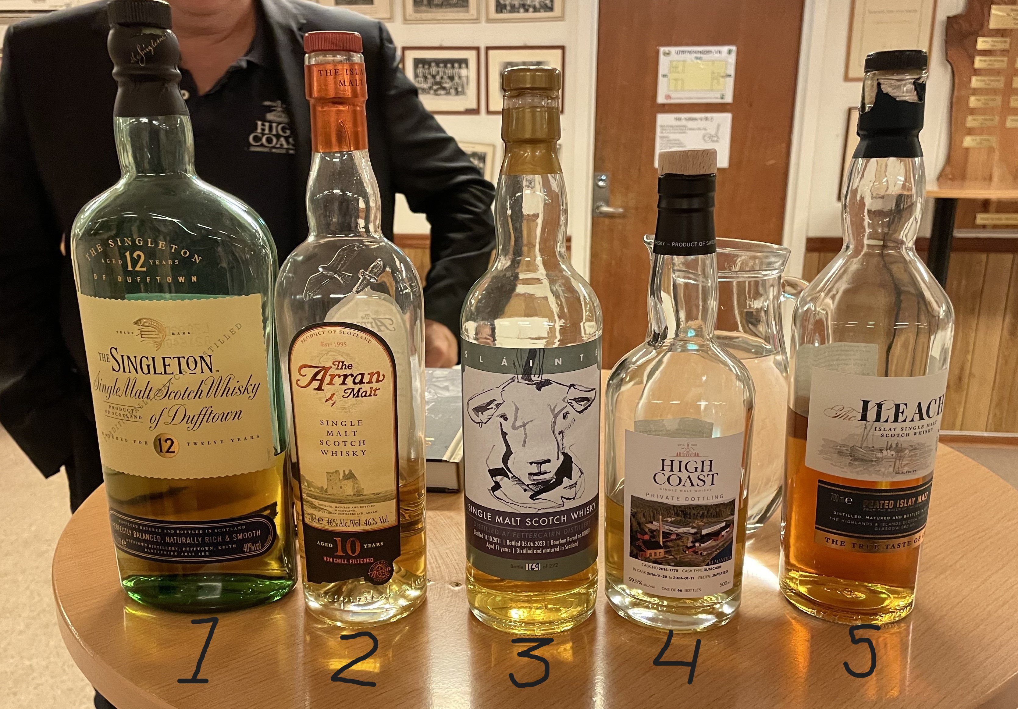 Deltagarna fick sedan fem glas med olika sorter. Före provningen fick vi en lektion i hur man går tillväga och vad man skall titta på t ex färgen. Känna på doften. Luta på glaset och se hur linjen ser ut om den är rak eller pärlar sig. Om det blir några gardiner eller ben när whiskyn rinner tillbaka i glaset mm. På detta sätt skall man kunna bestämma om det är en bra whisky och hur gammal den är.