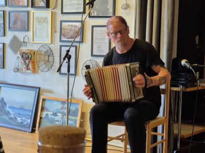 Efter föreläsningen serverades vi kaffe och hemmagjord ostkaka. Då fick vi lyssna på Jocke Nykvist som spelade några låtar på bälgaspel och gitarr.