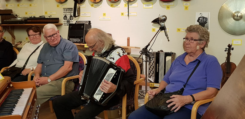 Foto: Sture Heiman. Spf medlemmen Ingemar Hedberg trakterar ett av museets bälgaspel till medlemmarnas stora förtjusning.