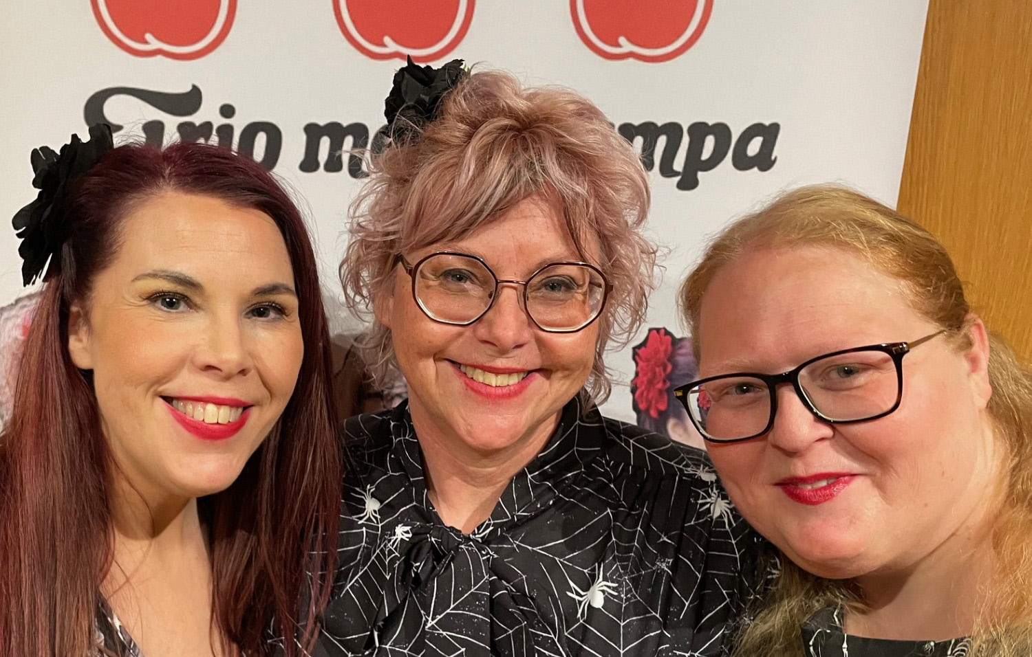Två förnämliga föredrag och en riktig minnestrip i popmusikens och rockens värld, det blefv facit av vårt månadsmöte i november 2025. Till vänster Cecilia Svanberg, sedan Maria Boström samt till höger Trio med rumpa.