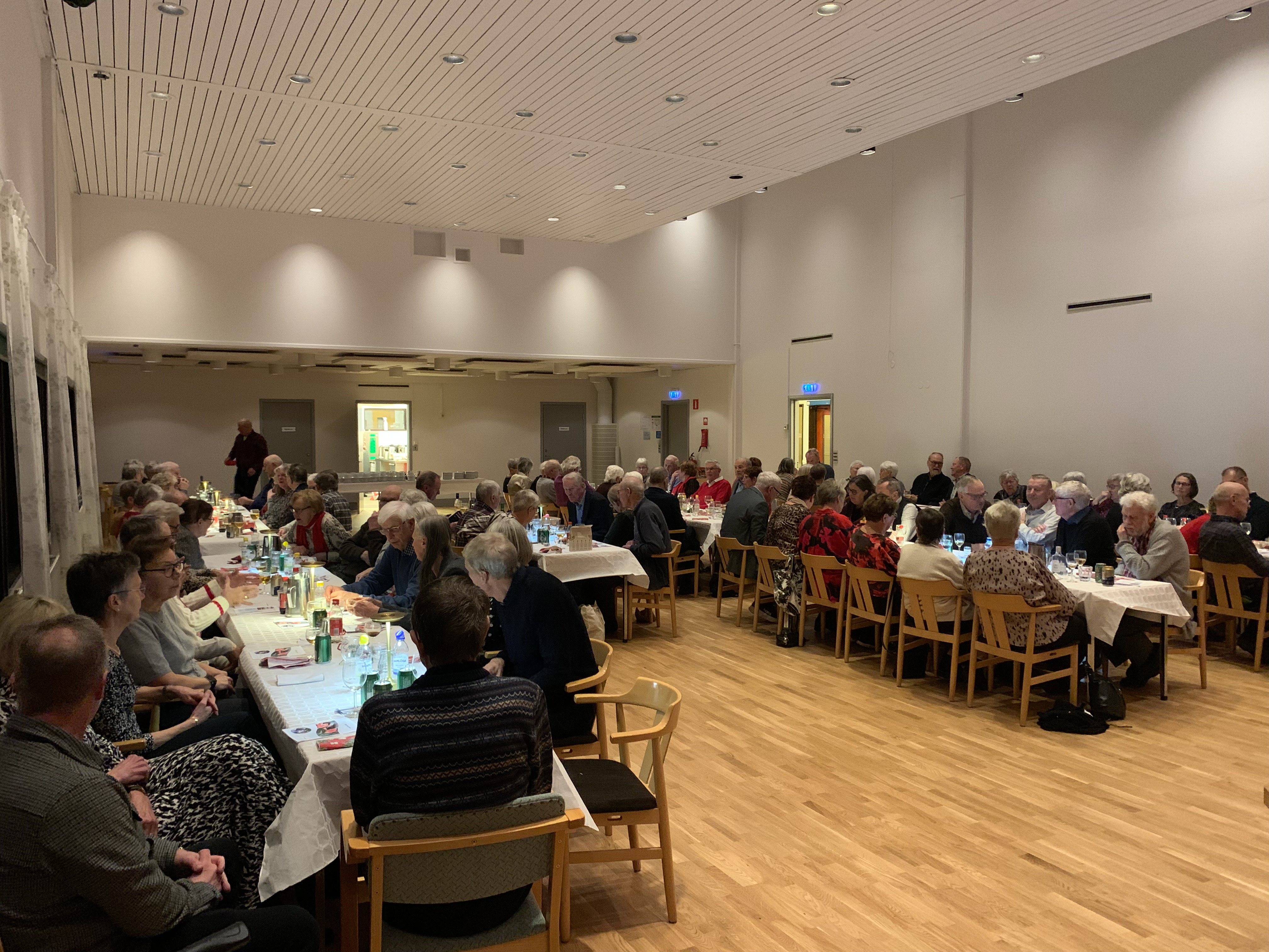 Kvällens servicegrupp såg snabbt till att den välmatade jullandgången kom på bordet så att festen kunde börja. Den höga ljudnivån vittnade om att samvaron blev precis så gemytlig och vänskaplig som tillstår en festkväll hos SPF Seniorerna.