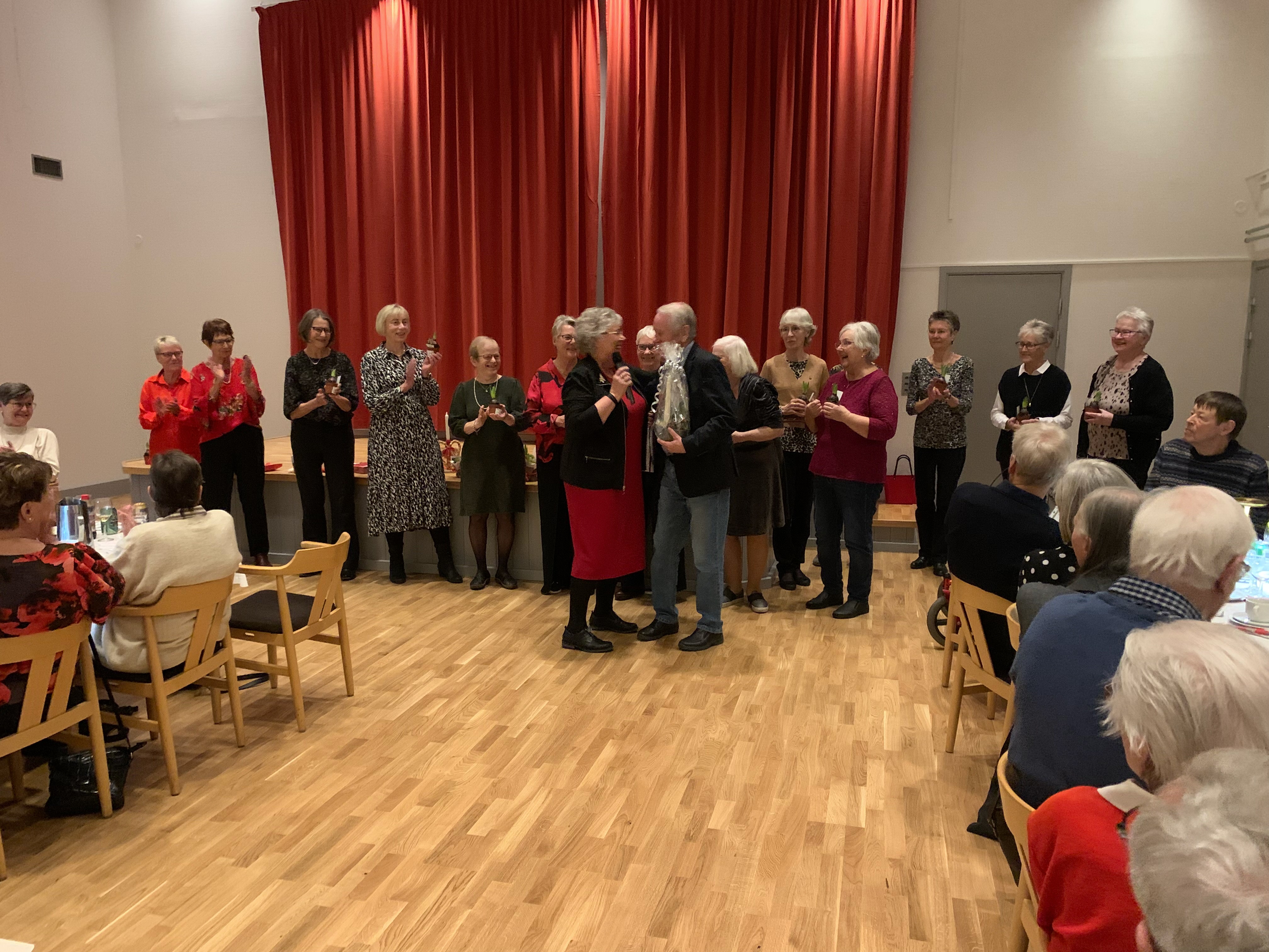 När det var dags för kaffe, pepparkaka och lite julgodis passade Sölve på att kalla fram alla de damer och herrar som under året varit aktiva i olika arbetsgrupper. Genom detta ville han visa att det är tack vare dessa frivilliga insatser som föreningen kan ha ett så brett och omfattande program som vi har. Till dessa drygt 30 personer överlämnade han en liten men mycket välment julgåva som symboliskt tack för gott och värdefullt arbete. Samtidigt riktade han en uppmaning till alla att tänka på vilka möjligheter en och var har att bidra till föreningens framtid. Det är tillsammans vi kan hålla föreningen igång.