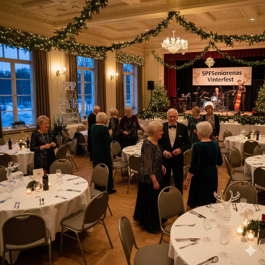 Precis lagom till den riktiga vinterns ankomst passade SPF Seniorerna i Virestad på att ställa till fest i Eneborg. 90-talet medlemmar inklusive glada gäster från Häradsbäck, Västra Torsås och Älmhult samlades runt de vackert dukade borden där ordförande Sölve Johansson hälsade välkomna och hoppades på en kväll i trivsam samvaro med god mat och roande underhållning. Han passade också på att göra ett kort sammandrag av fjolårets omfattande verksamhet och kunde då även meddela att vi fått inte mindre än 28 nya medlemmar och 10 nya vänmedlemmar. Ett rekordår för föreningen.