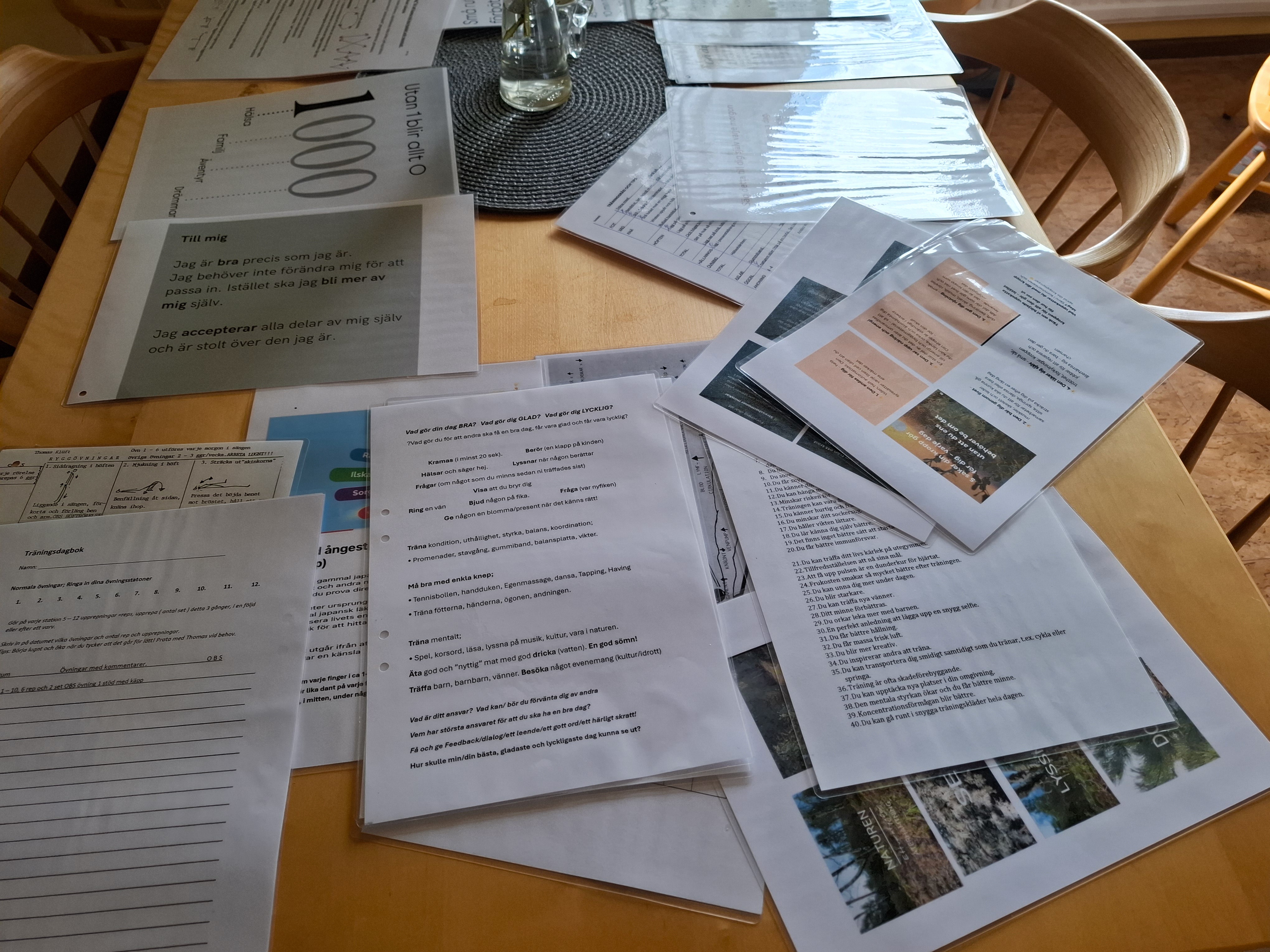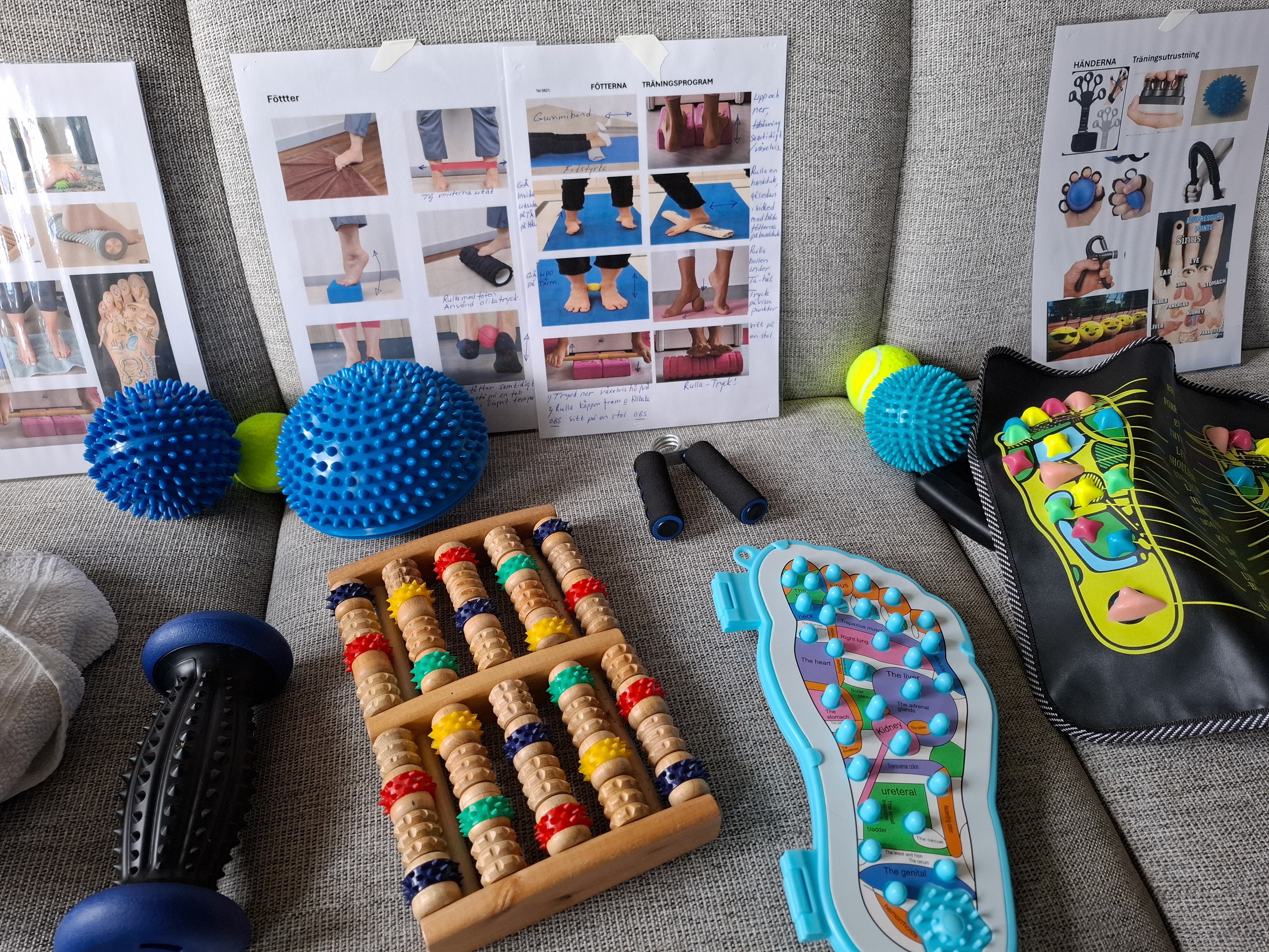 Teori varvades med praktiska övningar. Alla deltagare fick två tennisbollar. Vi satte fötterna på dem och rullade bollarna fram och tillbaka. Thomas hade lagt fram några stationer där olika övningar kunde göras. Han hade också flera skrivna sidor med uppmuntrande och goda råd.