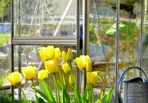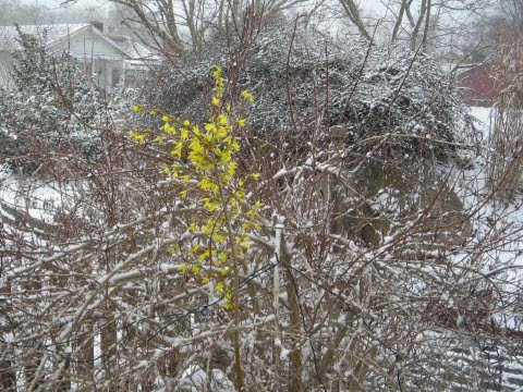 Bilden nedan är inte fotoshoppad! Den är arrangerad! Den gula fina forsytsian mitt i bild är intagen från annan buske i trädgården innan kylan och snön återvände! Ett par veckor till så blommar säkert denna buske också!