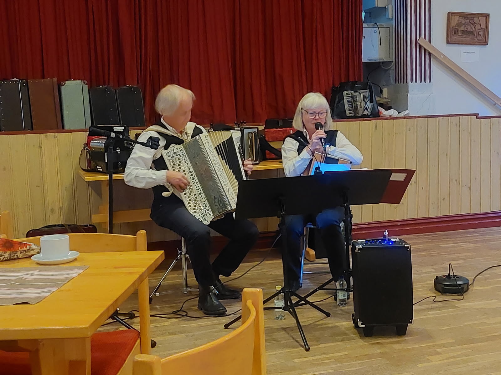 Därefter tog Mikael Svensson och Eva Jörgensson över och berättade om dragspelets historia som är nästan 200 år gammalt. De började med att spela 1-radigt dragspel och fortsatte sedan med 2-, 3-, 4-och 5-radigt dragspel. Imponerande att kunna spela på alla typer av dragspel som kräver olika teknik. I en paus serverades kaffe och äppelkaka, tillagade av medlemmarna Erika, Ingegerd, Kveta, Eivor och Elisabet. Efter kaffet fortsatta Mikael och Eva att underhålla oss med dragspelsmusik. De båda fick en lång och välförtjänt applåd.
