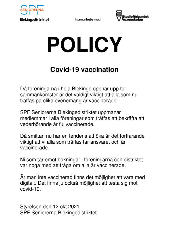 Styrelsen i Blekingedistriktet fattade 12 okt beslut om denna policy