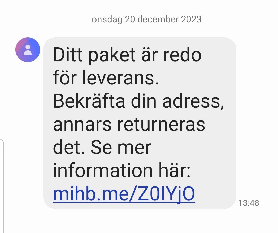 Det florerar bedragare i ännu högre grad nu i juletider. Via SMS, telefon, mail etc. Idag fick jag två olika SMS - meddelande om att logga in på en länk för att min leverans skulle ske. Se nedan hur SMS-meddelandet ser ut! ÖPPNA ALDRIG någon länk som ni inte litar på i synnerhet inte om du inte har beställt något! Riktiga meddelande om leveranser ser inte ut så här! Du skall inte lösa ut/betala något för att leveransen skall komma fram! I korrekt leveransmeddelande står leveransadress, ICA Maxi t.ex. samt en kod man skall visa upp. Har du beställt något på nätet och är osäker kontakta avsändare/säljare eller trp-bolaget!