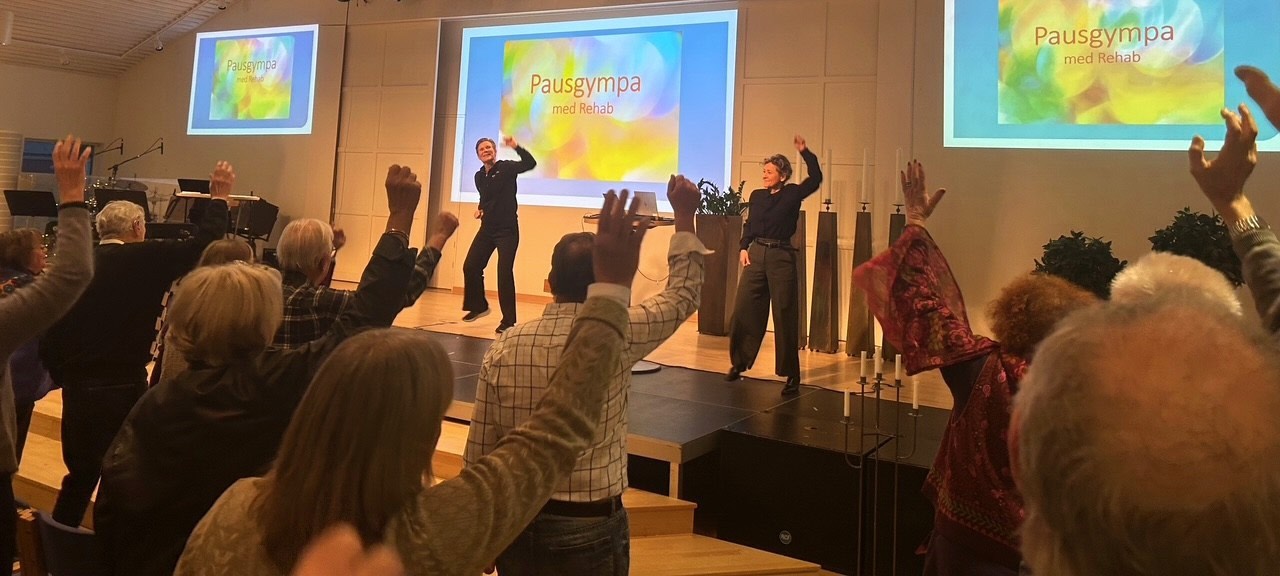 Mitt i programmet ledde Karin Jonsén, enhetschef på Närhälsans rehabmottagning - pausgympa som gav både rörelseglädje och ny energi.