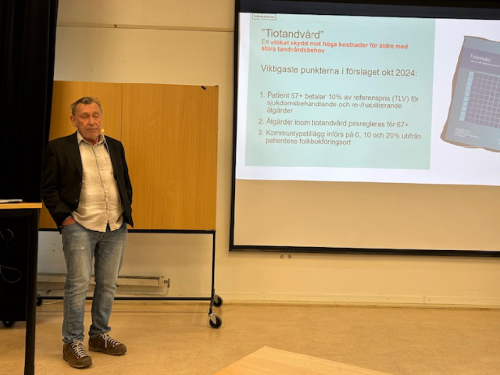 Gunnar Henning, övertandläkare vid Centrum för Äldretandvård informerade om 10-tandvården. Beslut tas i riksdag och regering inom kort. Personer 67 år och äldre betala 10 % av kostnaden, men bara för stora skador på de 10 främsta tänderna och bara för stora skador. Inget till förebyggande behandlingar.