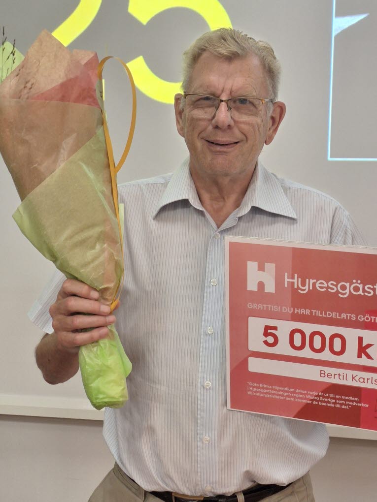 Bertil har genom åren varit en flitig arrangör av olika kulturella aktiviteter till vilka alla har varit välkomna. Arrangemangen har ägt rum i hans bostadsområde, Hällesåkersgården och Cykelstugan i Lindome och inneburit ett enormt frivilligt arbete för Bertil. Stipendiet är på 5 000:- och Bertil är med rätta stolt över uppskattningen.