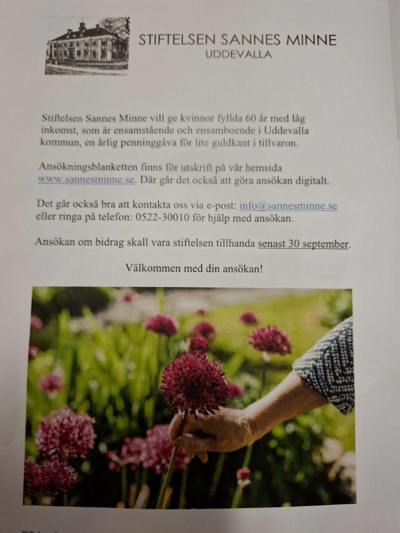 Stiftelsen Sannes Minne vill ge ensamlevande kvinnor 60+ med låg inkomst en möjlighet att ansöka om ett årligt stöd. Sista ansökningsdag 30 september. Välkommen med ansökan.
