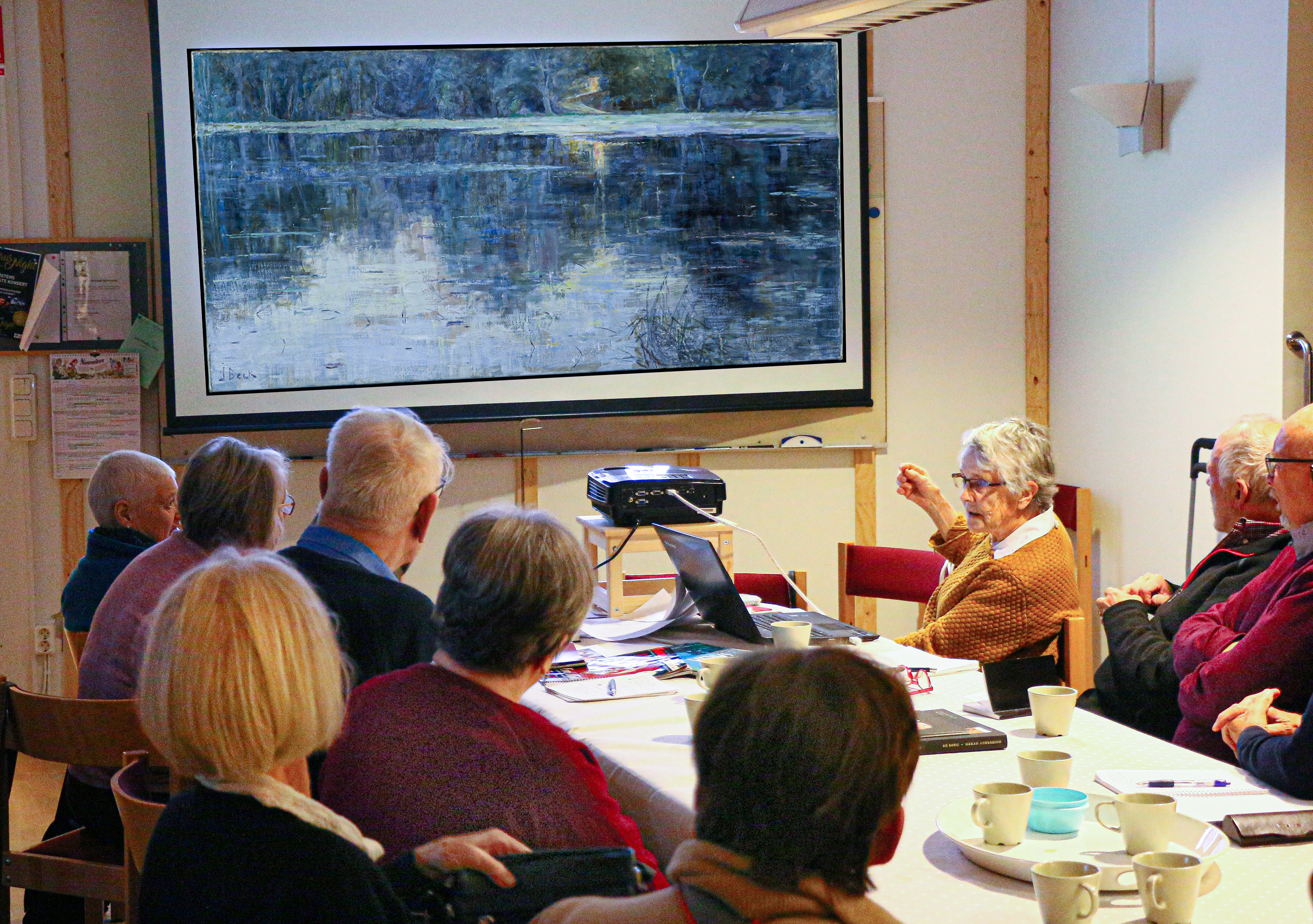 Jag ger en information om konstnären och hens liv, från det hen börjar måla och till dess verksamheten upphör. Detta sker i samband med bildspel dvs. foton jag tagit själv eller från nätet. På det sättet följer man hens utveckling.