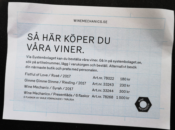 Och så var det dags för avsmakning av "Fistful of Love", "Gimme Gimme Gimme" och "Wine Mechanic". Se mer om Wine Mechanics och om vinerna på Wine Mechanics hypade hemsida.