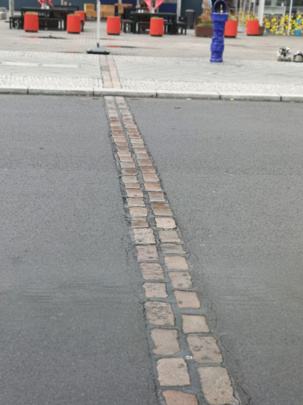 Där muren är borta markeras med dubbla rader gatsten. Enkelt och effektfullt.
