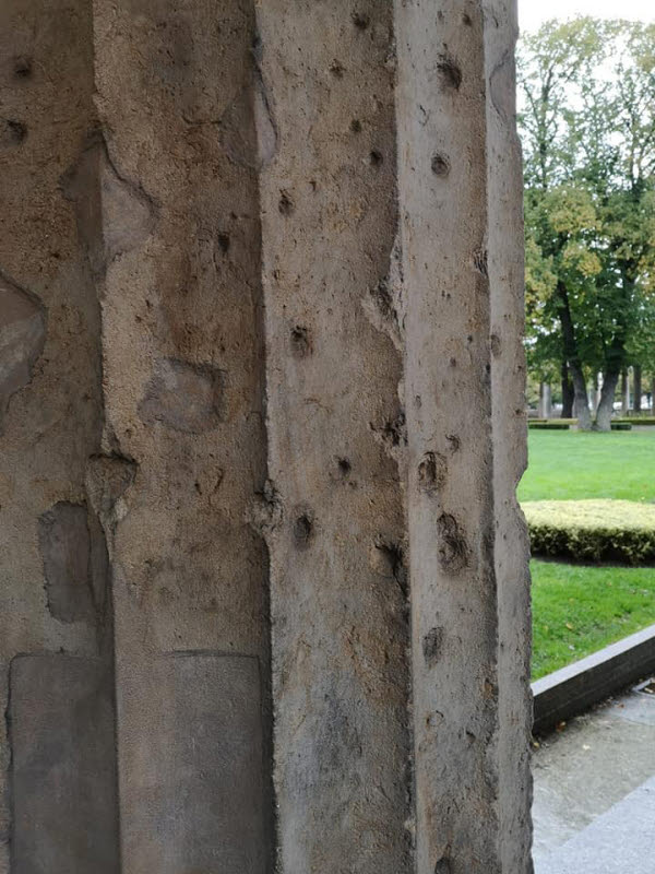 Vid restaureringen har vissa delar sparats i krigsskadat skick, för att man inte skall glömma.