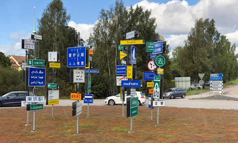 När vi kom fram till Älmhult körde Thomas ett par extra varv i en rondell med ett av tre konstverk, kallade "Världens hem". Detta består av färgglada vägskyltar på alla olika språk som numera kan höras i samhället .