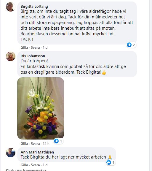 Jag vill även tacka Marianne Ambjörn för hennes stora kompetens i geriatriska frågor men även Gerd Hallin för uppföljning av tablettgenomgångar med våra Vårdcentraler i Härryda. Kanske har lårbensbrott förhindrats? Bo Axelssons stora kompetens och pedagogiska förmåga gällande SOL och inte minst " skälig och god" har varit ovärderlig. Tack också alla PROare ingen nämnd och ingen glömd för mycket konstruktivt samarbete och även tack till alla våra kunniga politiker i rådet.