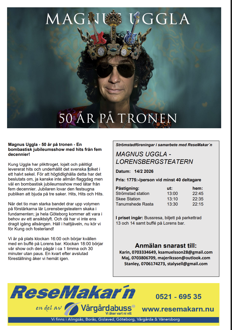 jubileumsshow Magnus Uggla Lorensbergteatern 14 februari 2026